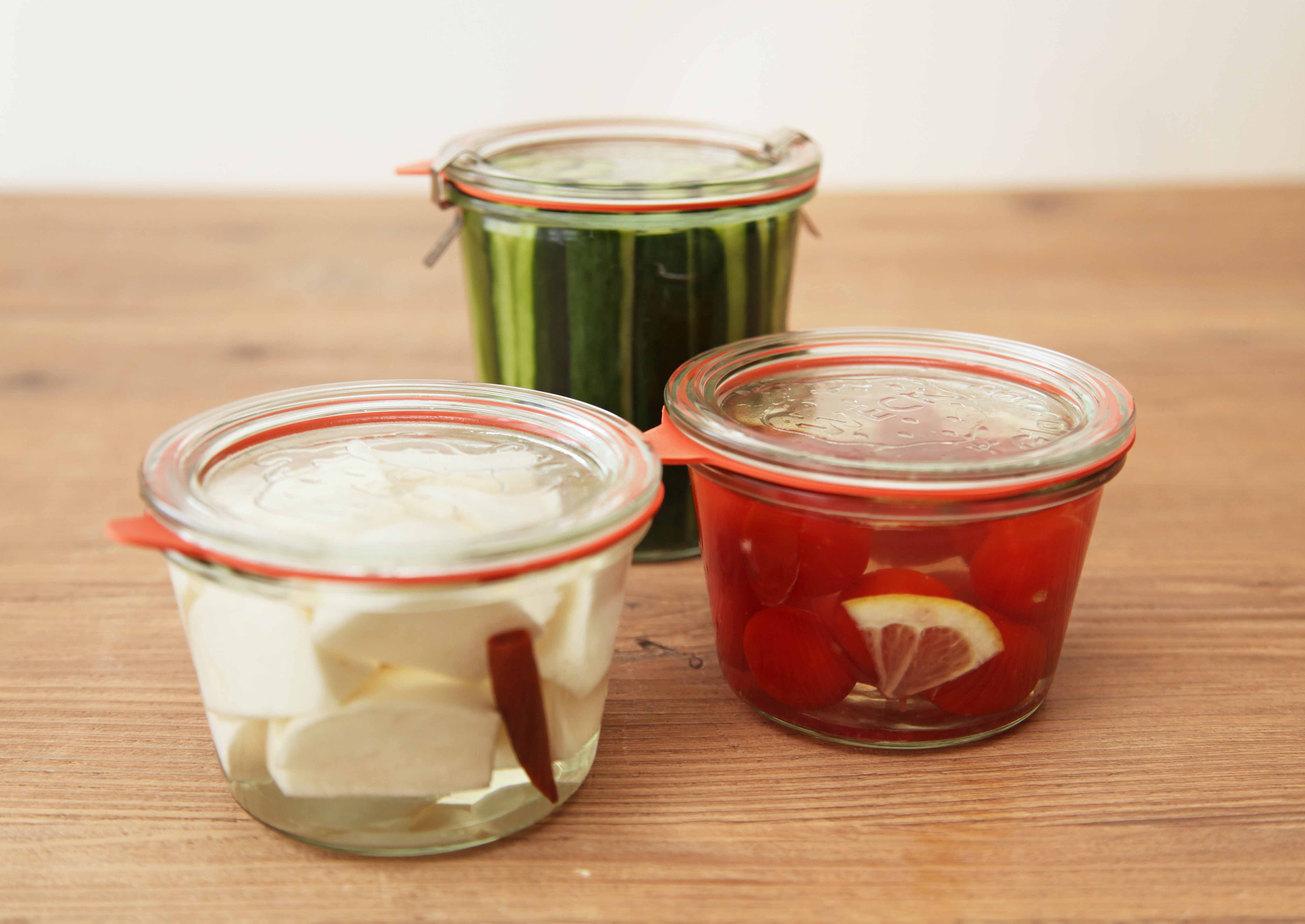• それぞれの保存容器にきゅうり・B・Cを入れ、昆布を抜いた(1)を注ぎ入れる。蓋をして冷蔵庫で一晩以上おく。