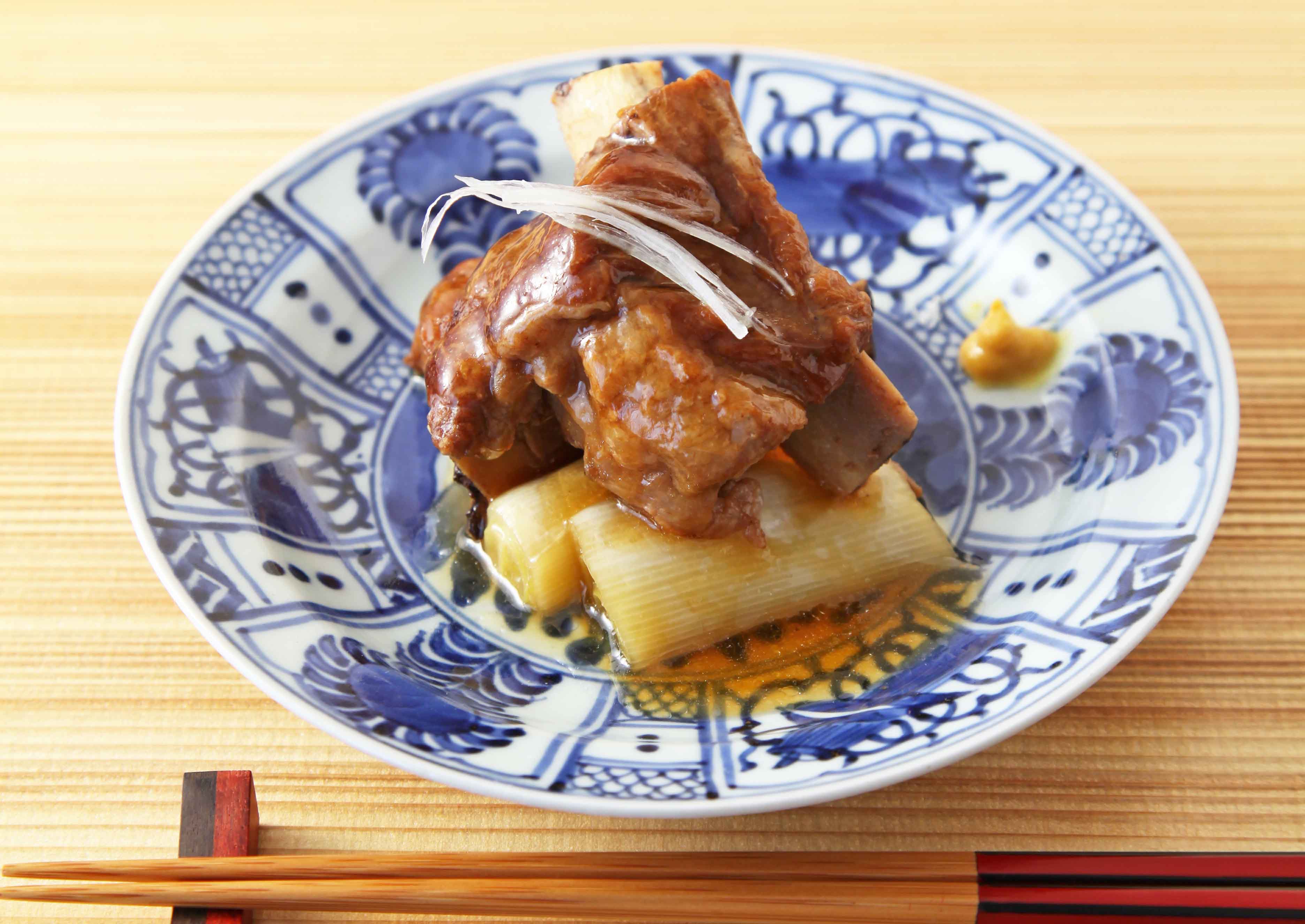 • スペアリブを取り出して器に盛り付け、残った煮汁に水溶き片栗粉を加えてトロミをつける。煮汁を上からかけ、白髪ねぎとお好みで練りからしを添える。