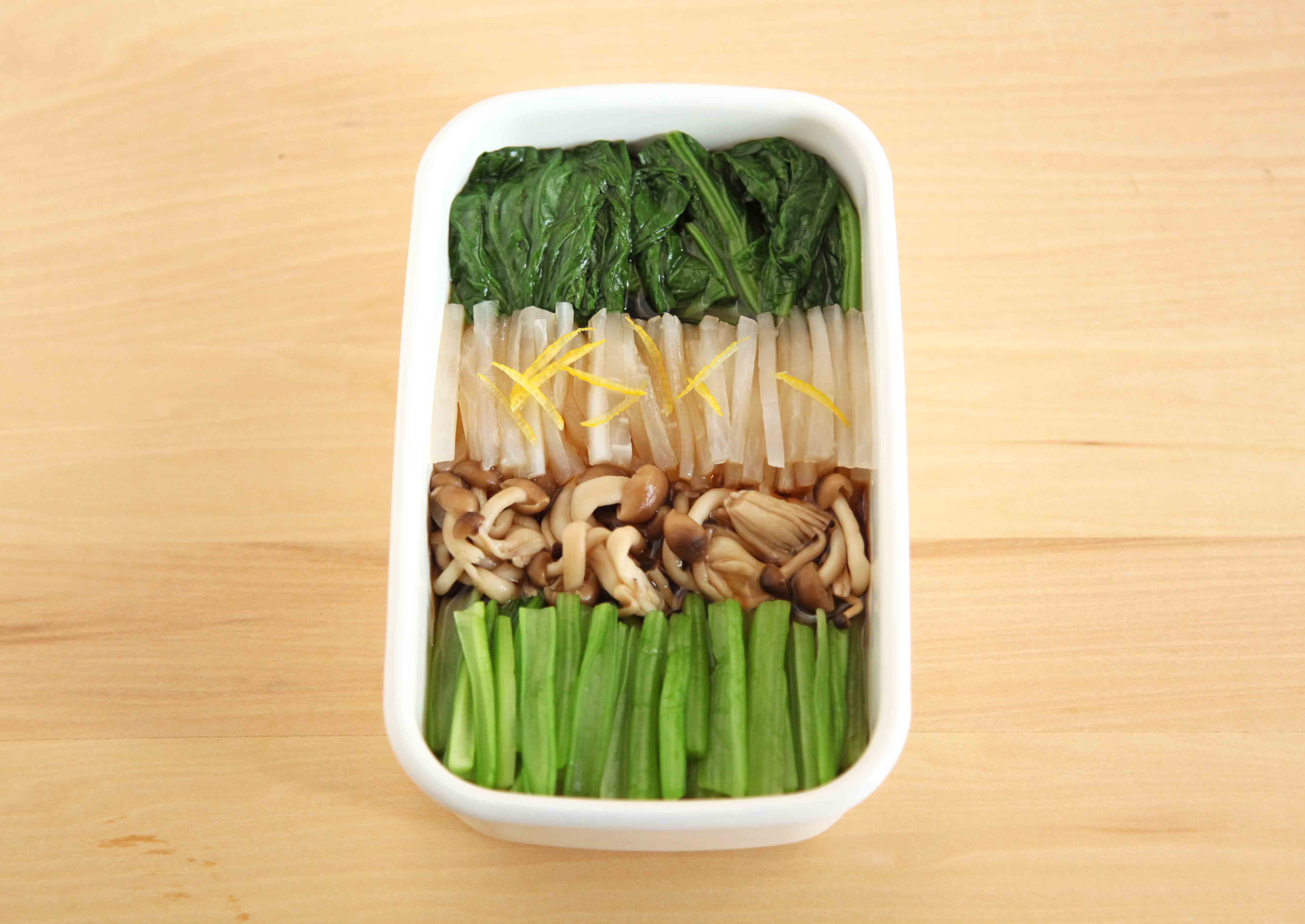 • 塩(分量外)を加えた熱湯で小松菜を茎・葉それぞれ10~15秒茹でて冷水に取り、水気を絞る。同じ湯で大根を30秒茹でてザルに上げ、粗熱が取れたら水気を拭き取る。