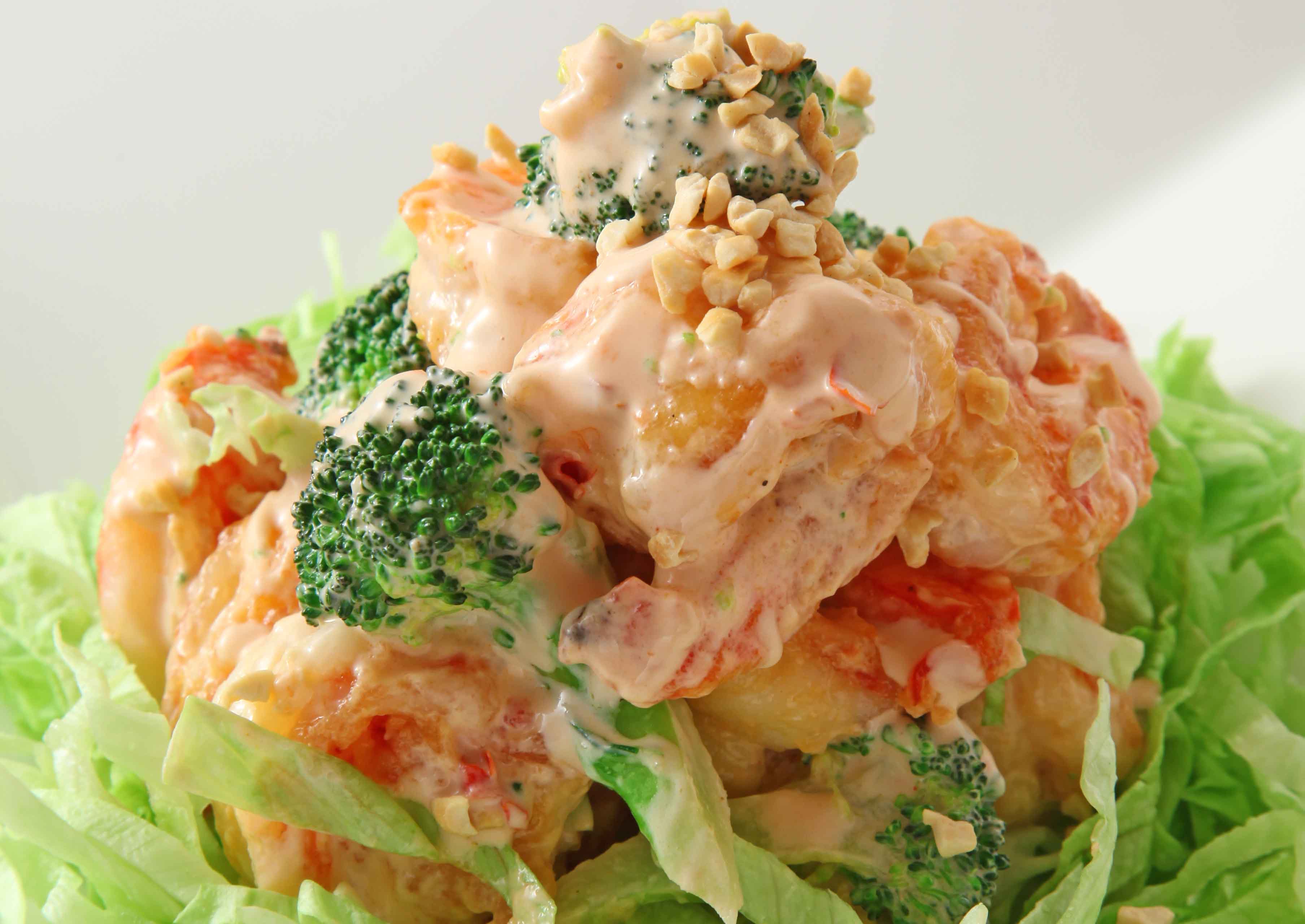 えびとブロッコリーを合わせたBで和えて器に盛り付け、粗く刻んだピーナツを散らす。お好みで千切りにしたレタスと一緒にいただく。