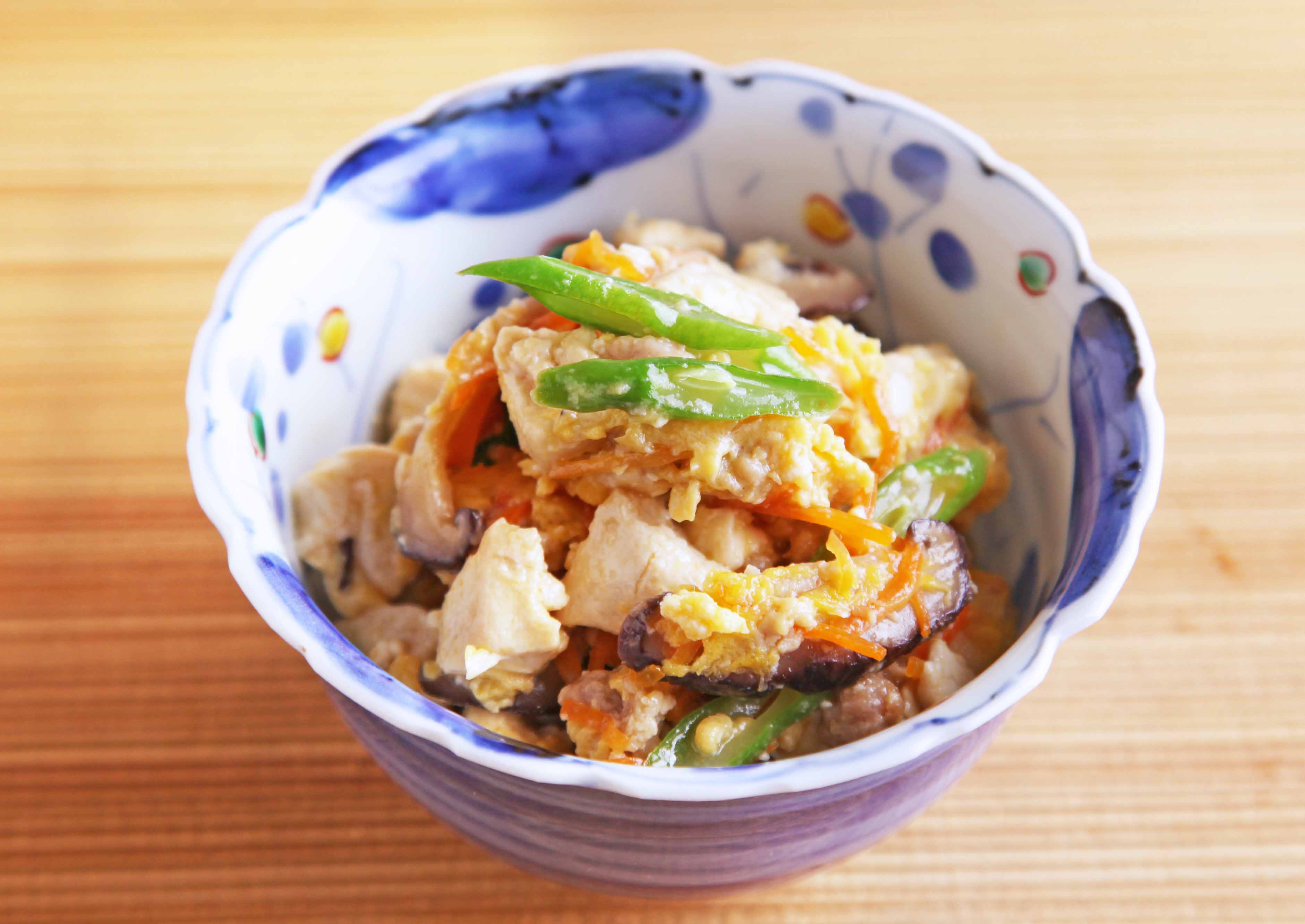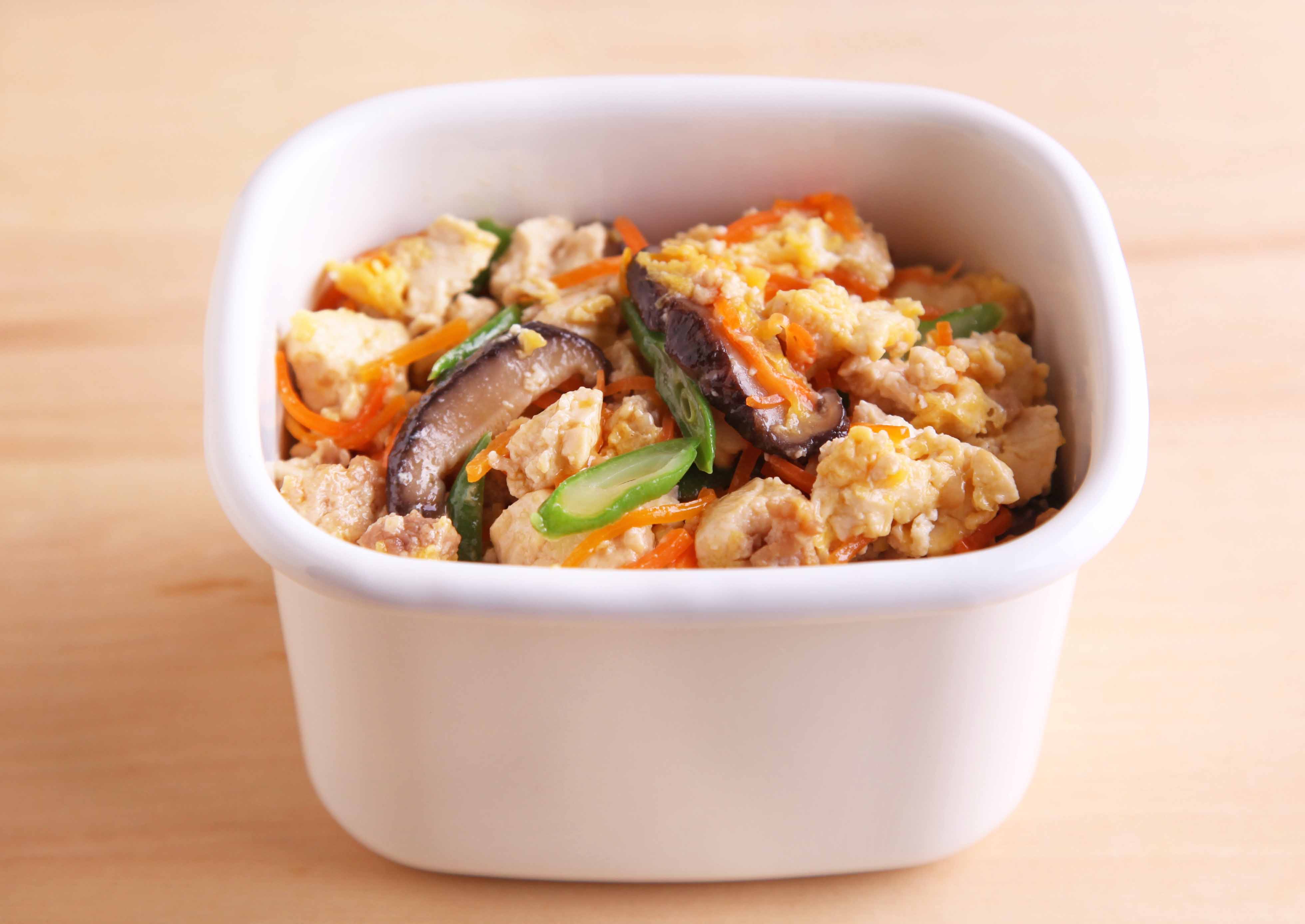 うま味たっぷりの鶏肉やしいたけと木綿豆腐を一緒に炒め煮にし、卵でとじた食べごたえのある常備菜です。