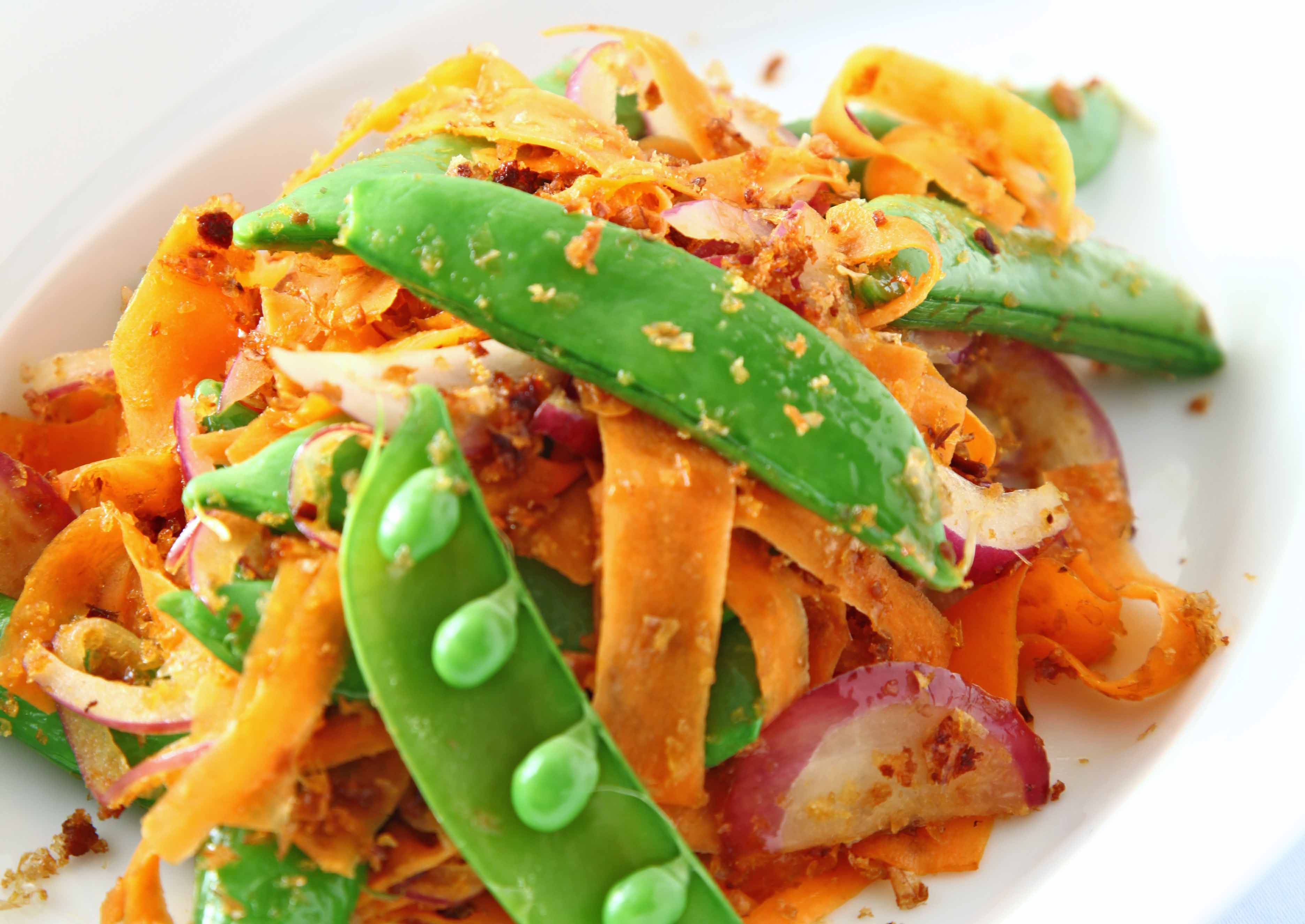 スナップえんどうは筋を取り、塩(分量外)を加えた湯でサッと茹でる。にんじんはピーラーでリボン状にし、紫玉ねぎは薄切りにする。