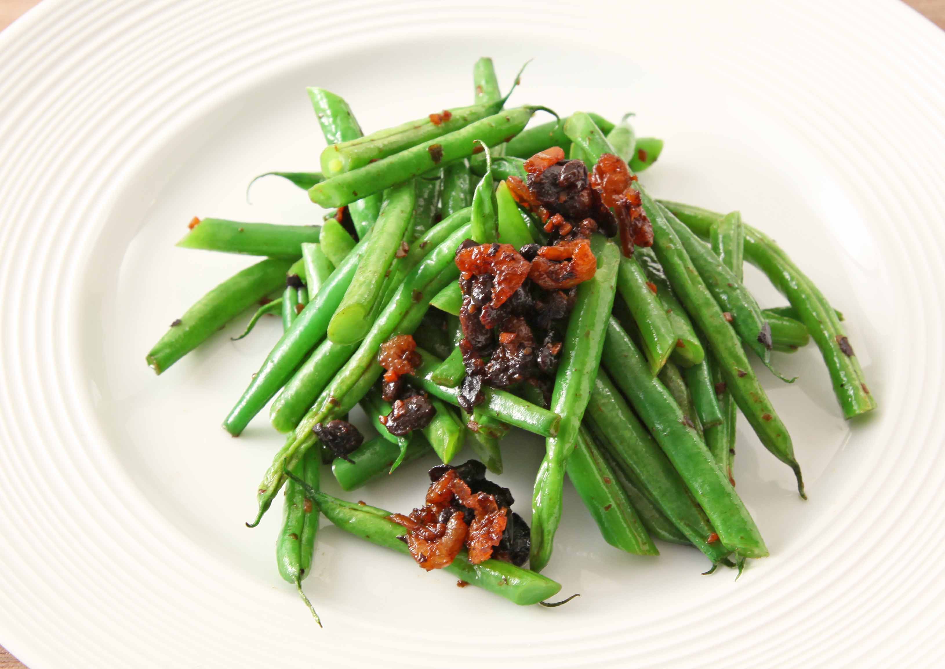 食感をいかしたいんげんに干しえびとトウチのうま味が絡んだ、中華風の炒め物です。
