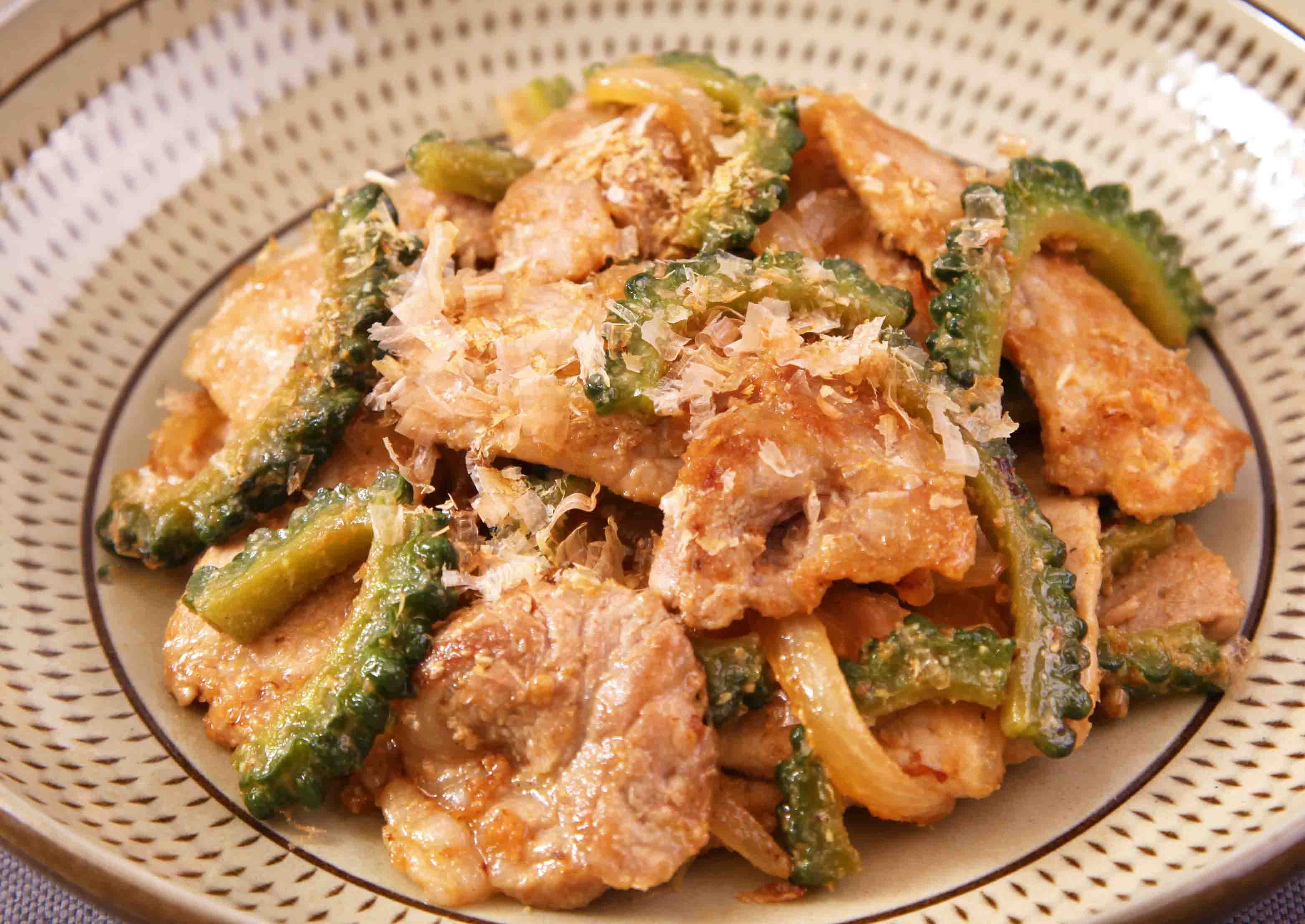 チャンプルーとはひと味違う、甘みそを使った豚肉の炒め物。ゴーヤの苦みをみそとかつお節でやわらげ、苦手な人でも食べやすくしました。