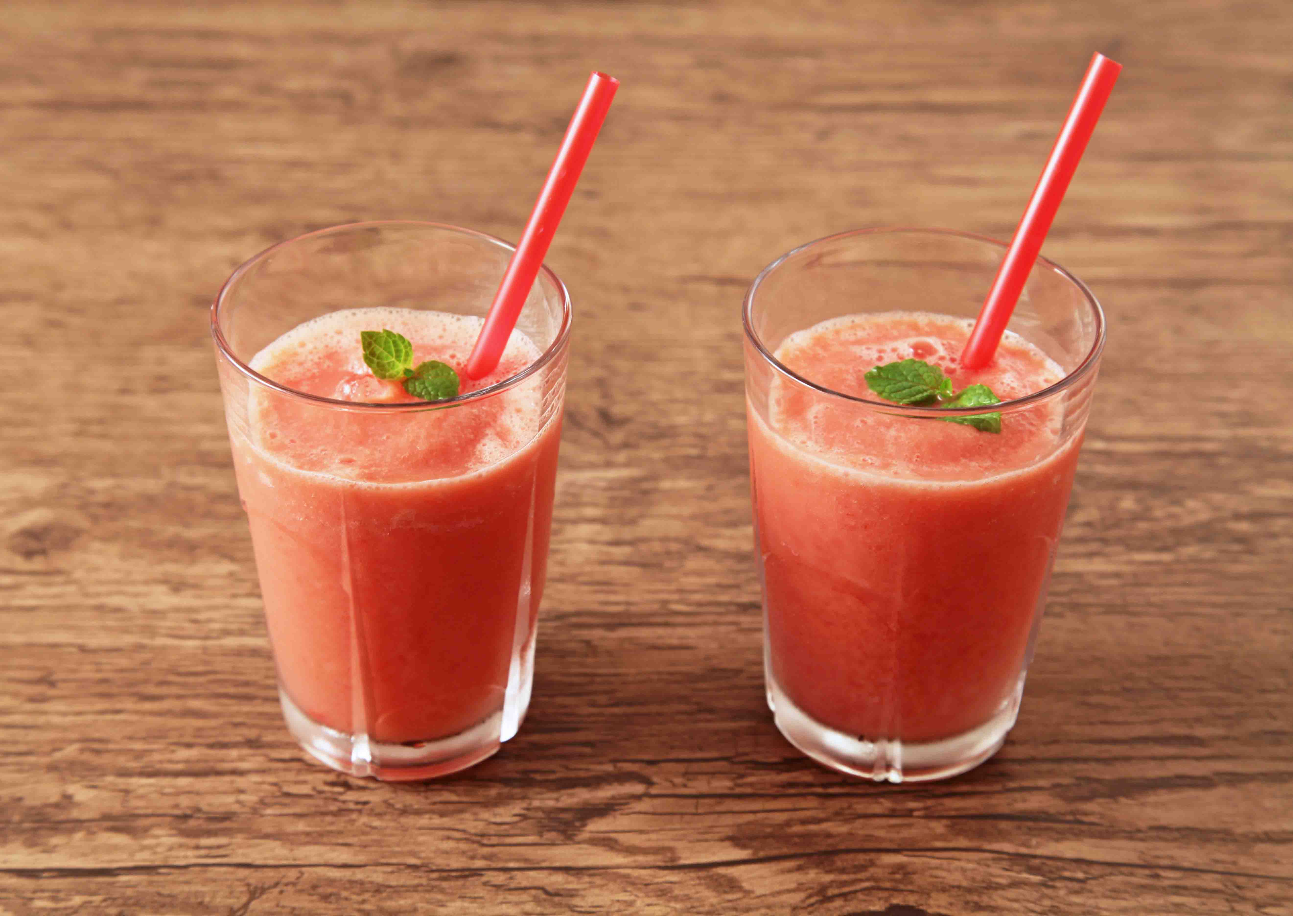すいかの約9割は水分ですが、ほかにも免疫力を高めるビタミンAやリコペン、利尿作用のあるカリウムを多く含んでいます。カリウムは汗と共に失われやすいので、スムージーを飲んで水分補給と不足したミネラルを補いましょう。
