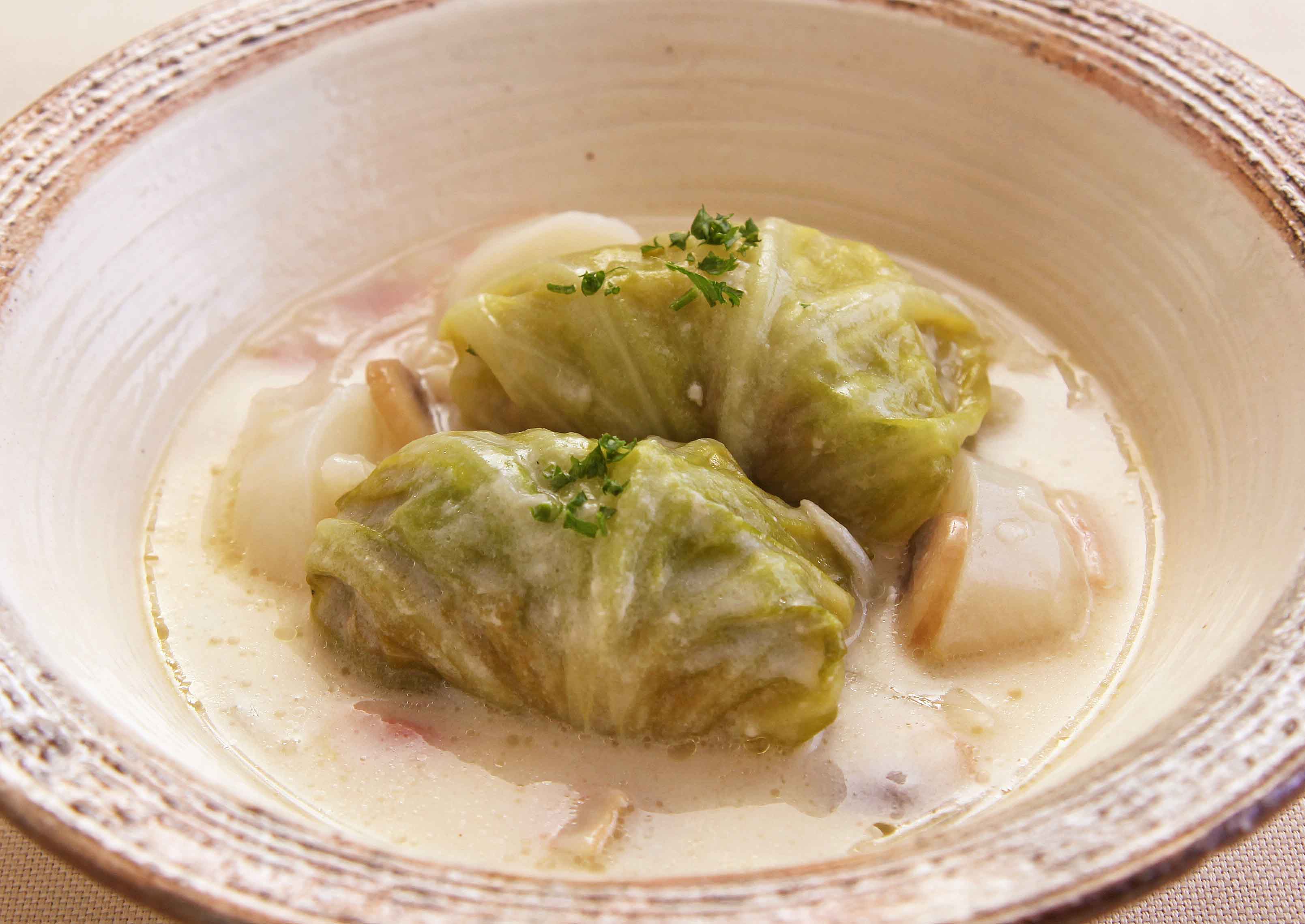 人気の洋食メニューのロールキャベツを、濃厚なホワイトソースで煮込みました。キャベツの甘味と肉のうま味が溶け出し、スープまでおいしくいただけます。