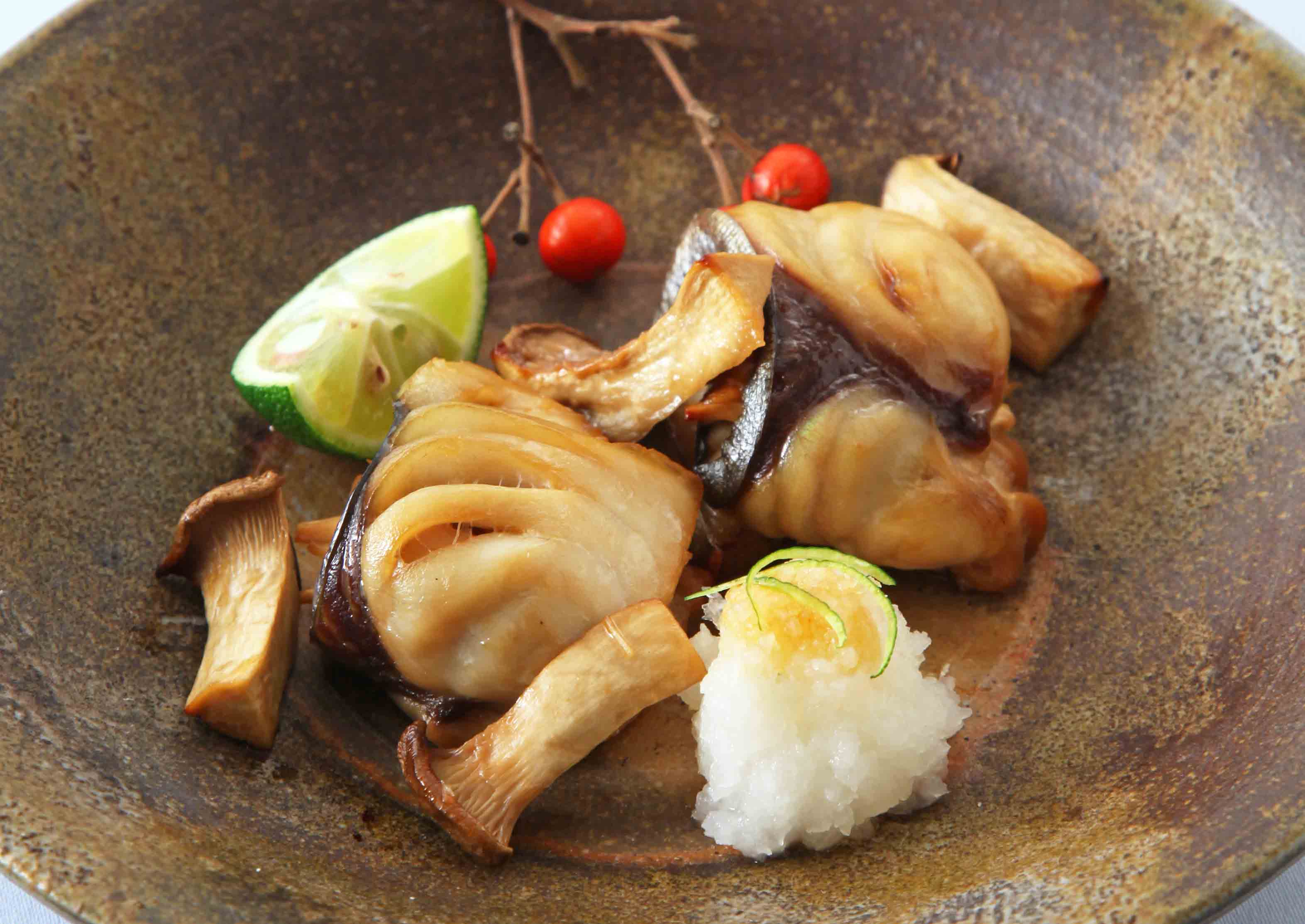 脂ののった旬のさわらでエリンギを巻き、こうばしく焼き上げた、すだち香る幽庵焼きです。