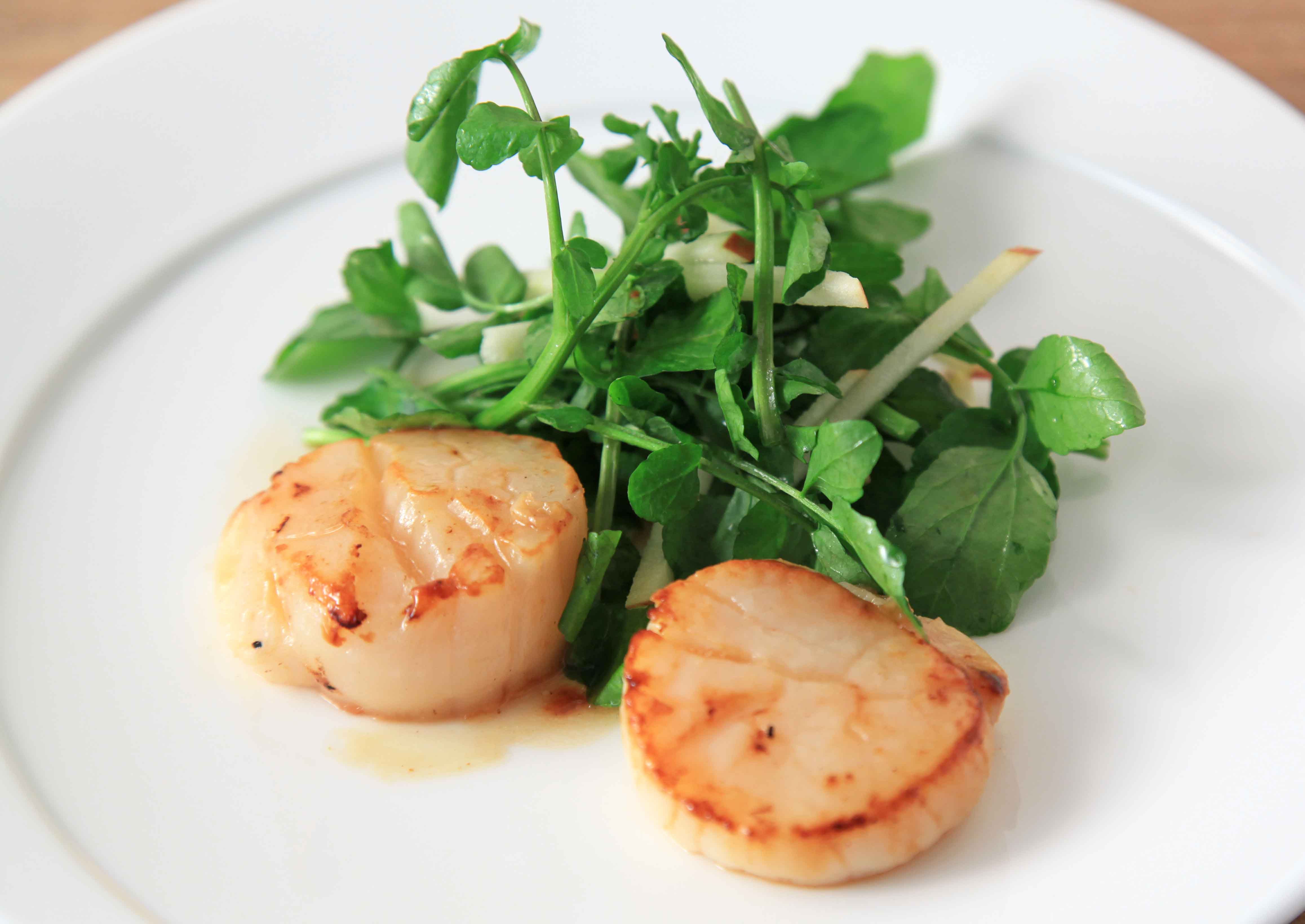 ふっくらと焼き上げたほたてのソテーに、さっぱりとしたクレソンとりんごのサラダを合わせました。
