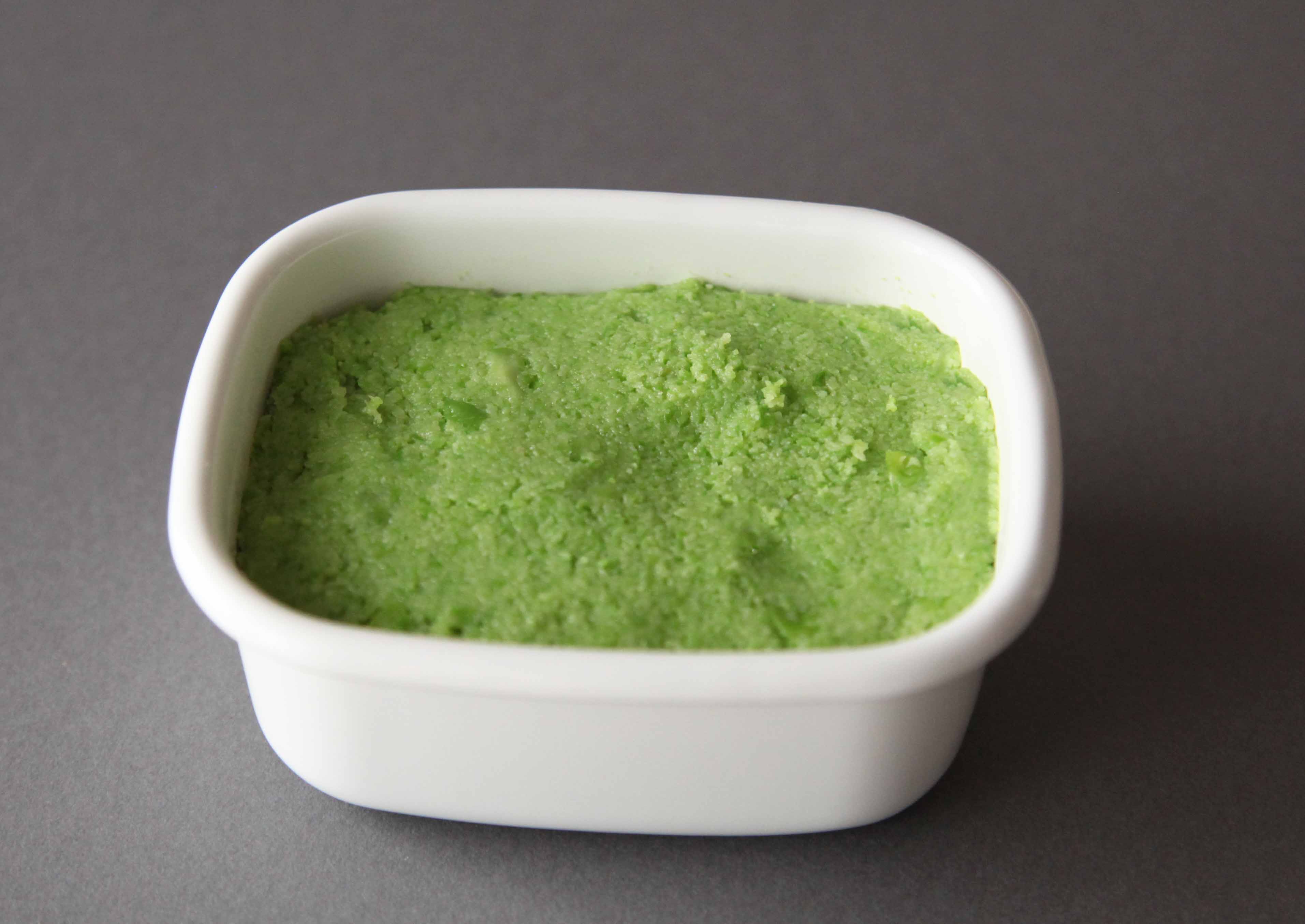 600Wのレンジで(1)を約2分温めて砂糖を加え、枝豆が熱いうちにすり鉢またはフードプロセッサーで潰す。