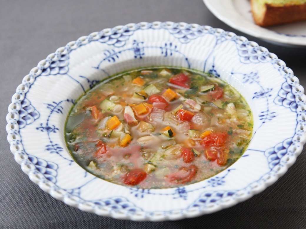 たっぷり野菜とベーコンのうま味がつまった具だくさんスープ。今回はバジルソースを加えたジェノバ風ミネストローネです。