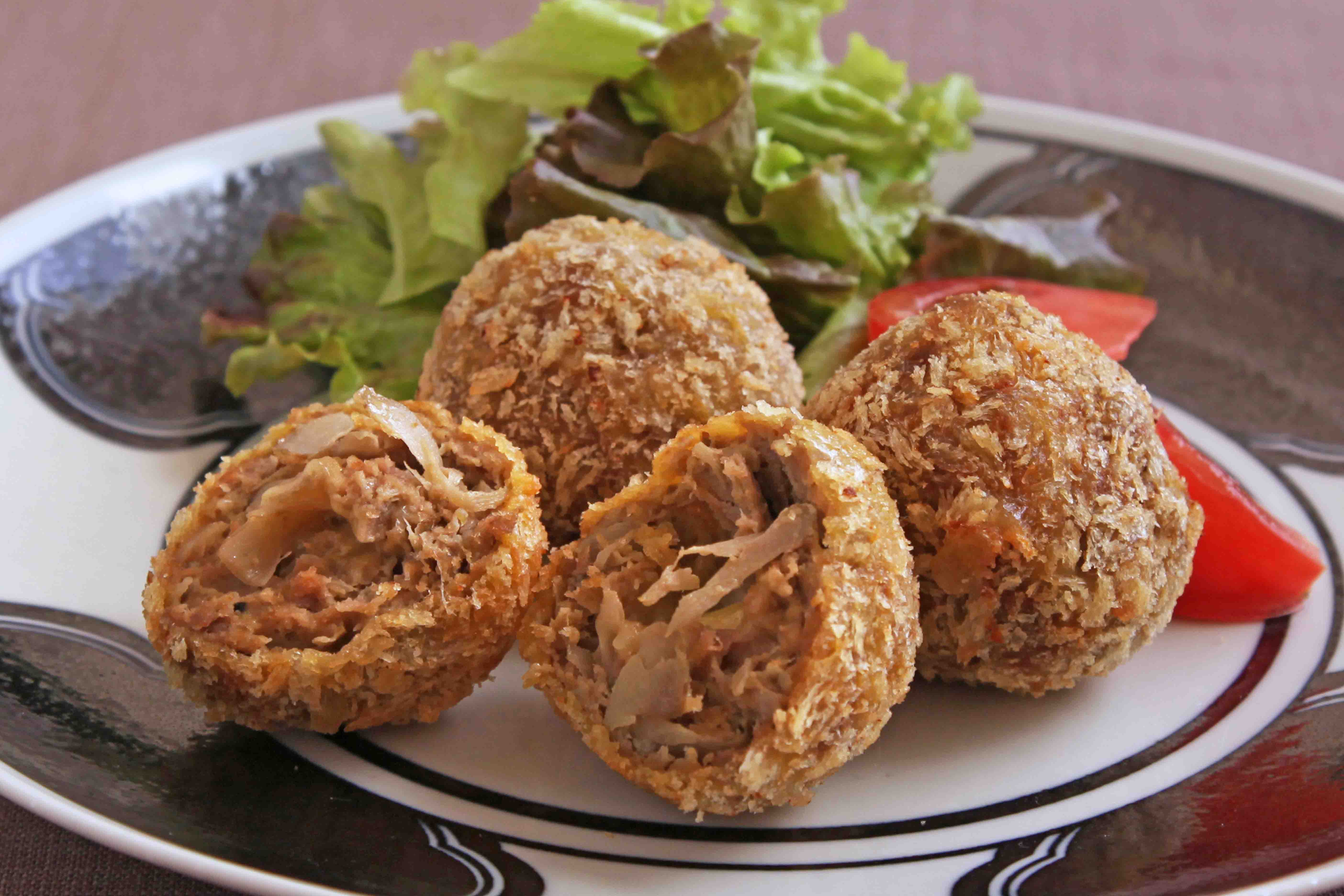 ジューシーな肉だねにささがきごぼうをたっぷり入れた、チーズ入りメンチカツ。