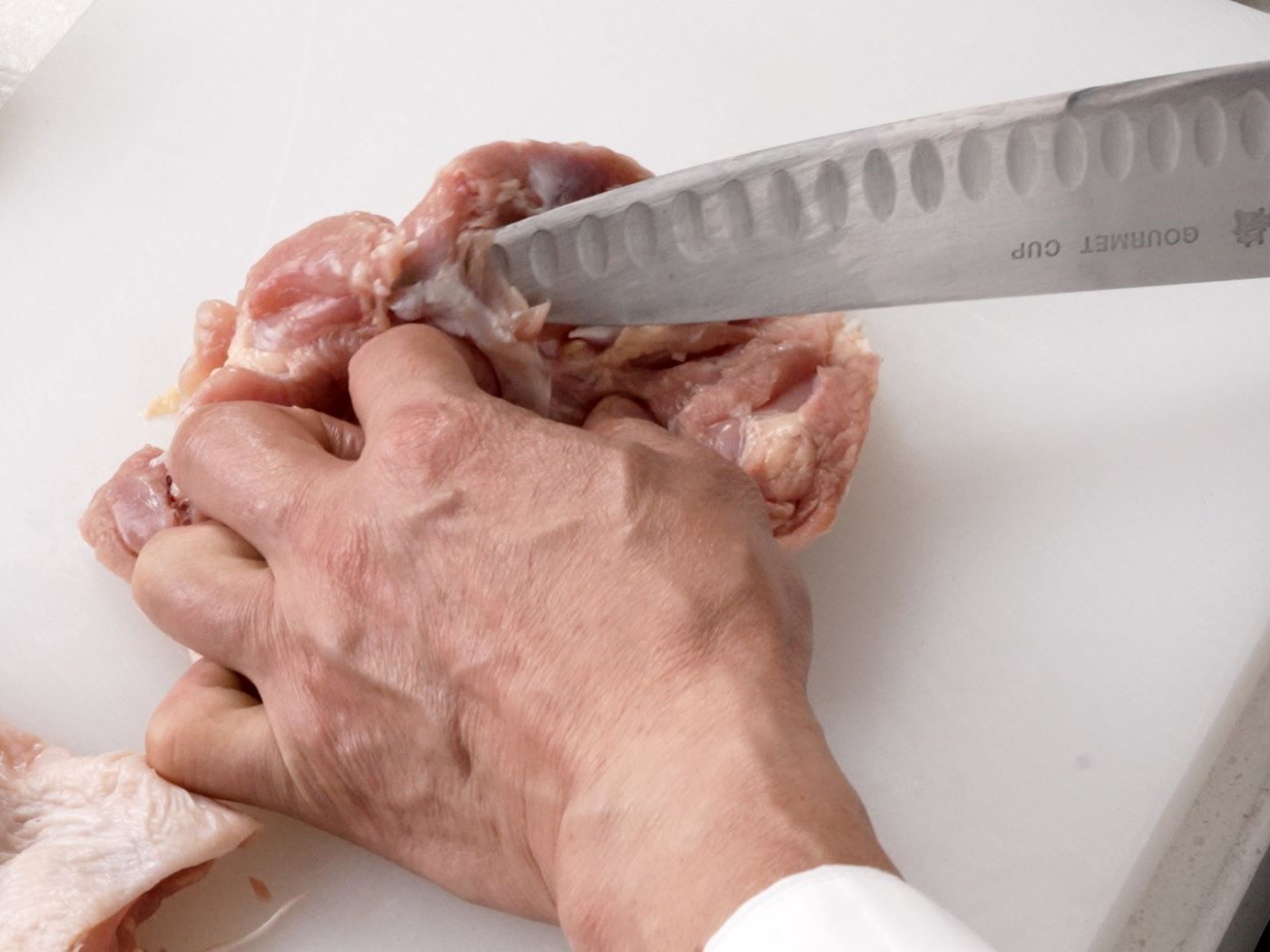 鶏肉は筋や軟骨などがついていたら取り除き、肉の厚みが均等になるように、切込みをいれて広げる。塩・こしょうしておく。