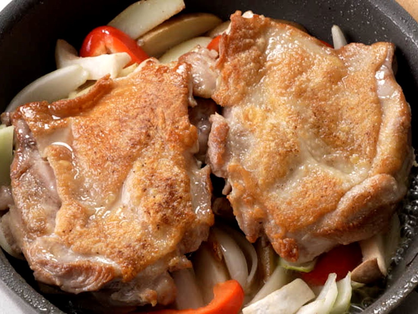 (5)の野菜の上に(4)のチキンを皮目を上にしてバットに残った汁ごとのせ、チキンコンソメを加えて沸いたら蓋をして蒸し焼きにする。約10分蒸し焼きにしたら、鶏肉を取り出して、付け合せを更に炒めて汁気を飛ばし、盛り付け皿に盛る。