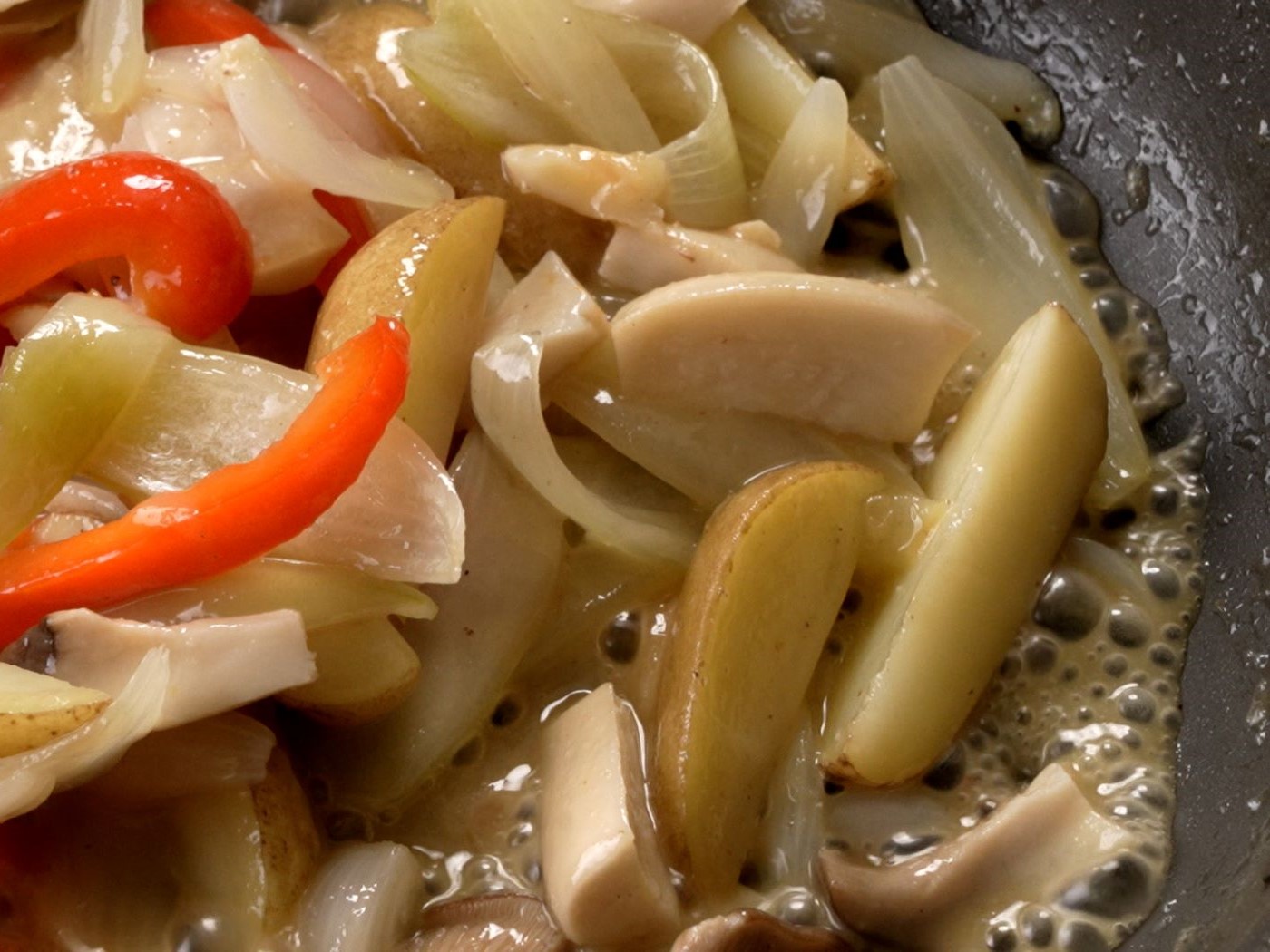 にんにくは半分に切って芽を取り除き、1/4程度の大きさに切ったら叩いてつぶしておく。玉ねぎは根の部分をを取ってくし型に切ってほぐしておく。パプリカは種を取ってくし切り、エリンギもくし切りにしておく。メークインはよく洗い、皮付きのままくし切りにしておく(水にさらさない)。