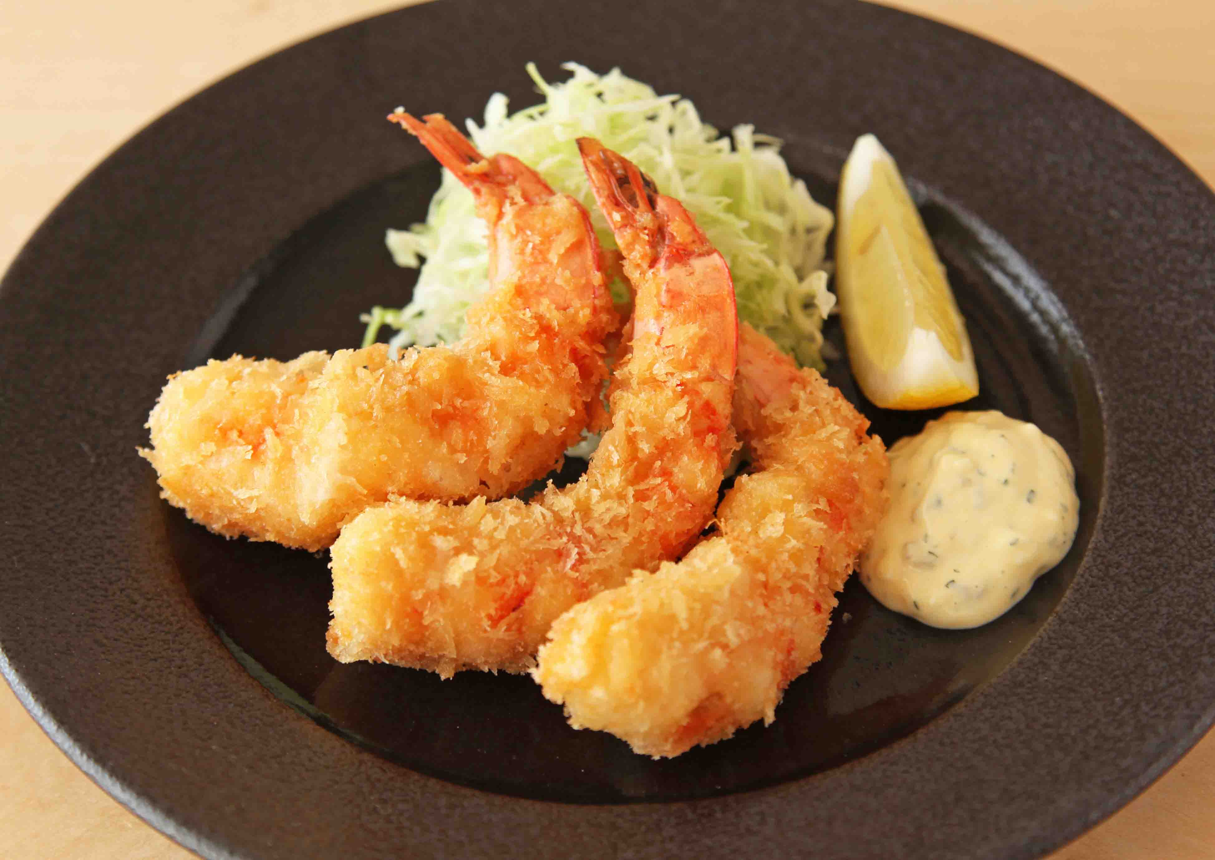 プリっとしたえびの食感とサクサクの衣がたまらない!みんなが大好きなフライです。手作りのタルタルソースをたっぷりつけていただきます。