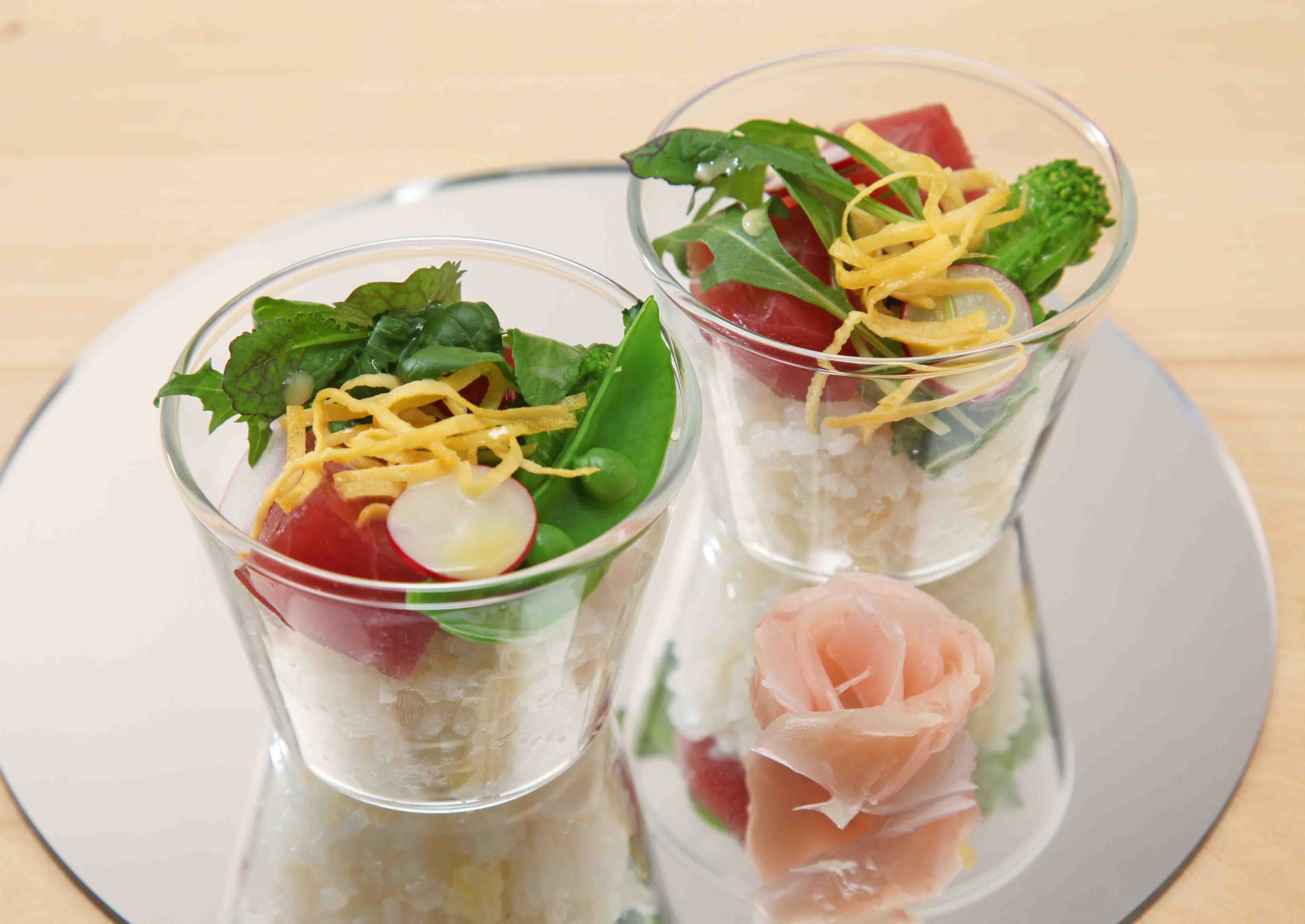 鉄火丼風のちらし寿司に春らしいフレッシュな野菜をたっぷり添えた女性にうれしいサラダ寿司です。