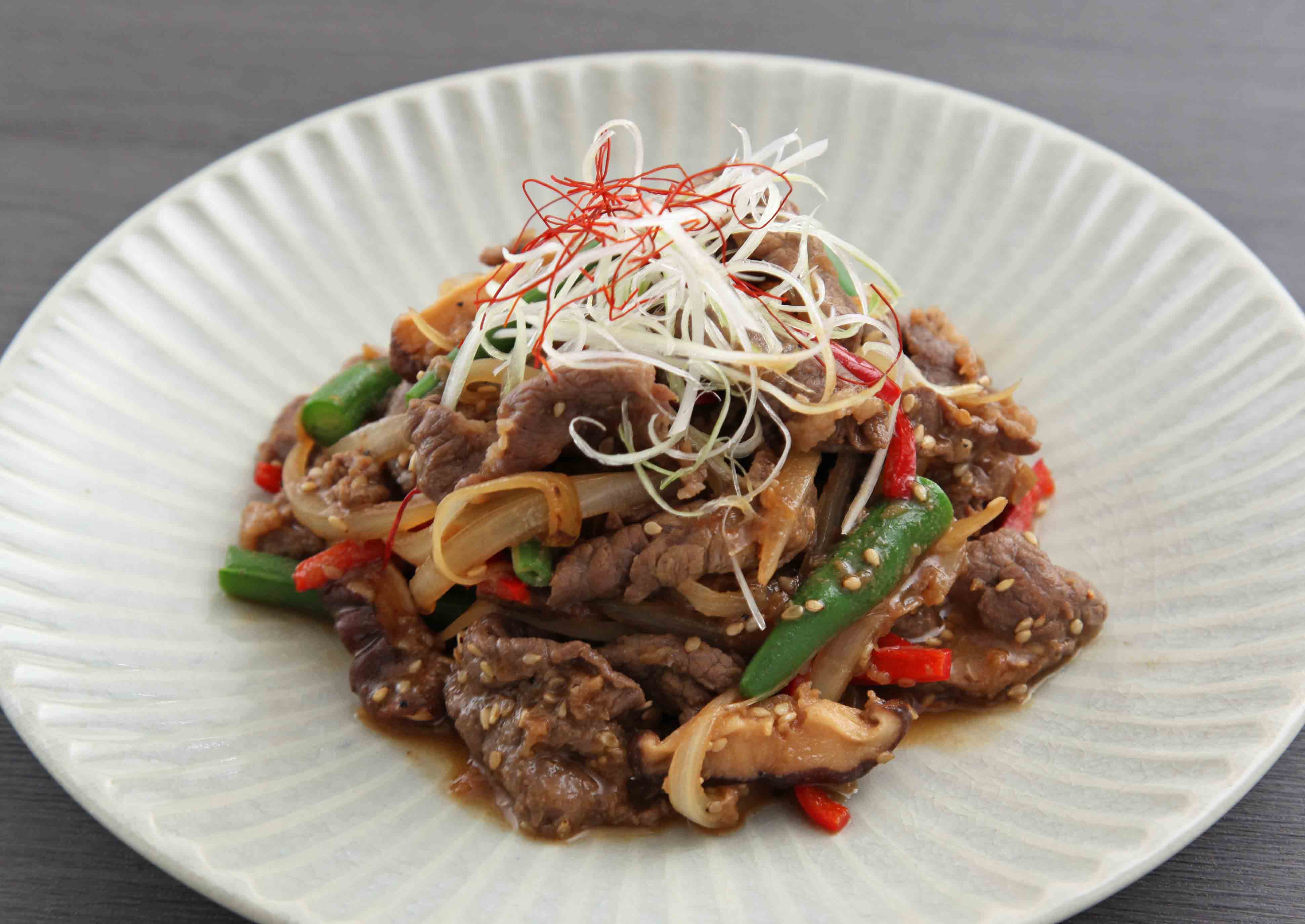 甘辛いたれにつけた牛肉とたっぷりの野菜を炒めた、人気の韓国料理です。