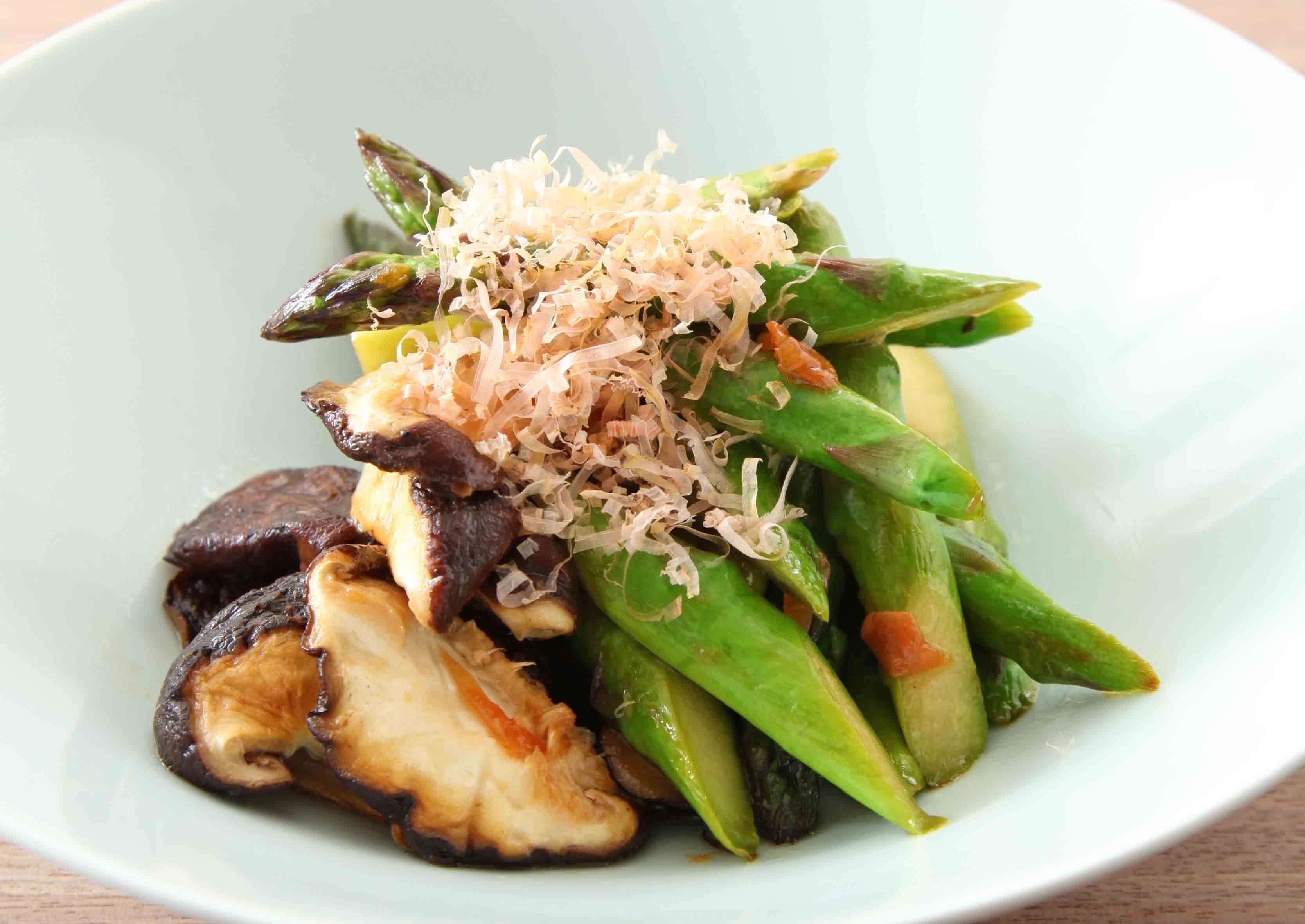 今がおいしいアスパラガスと旨味たっぷりのしいたけをこうばしく焼いてつけ込んだ、梅香る和風マリネ。