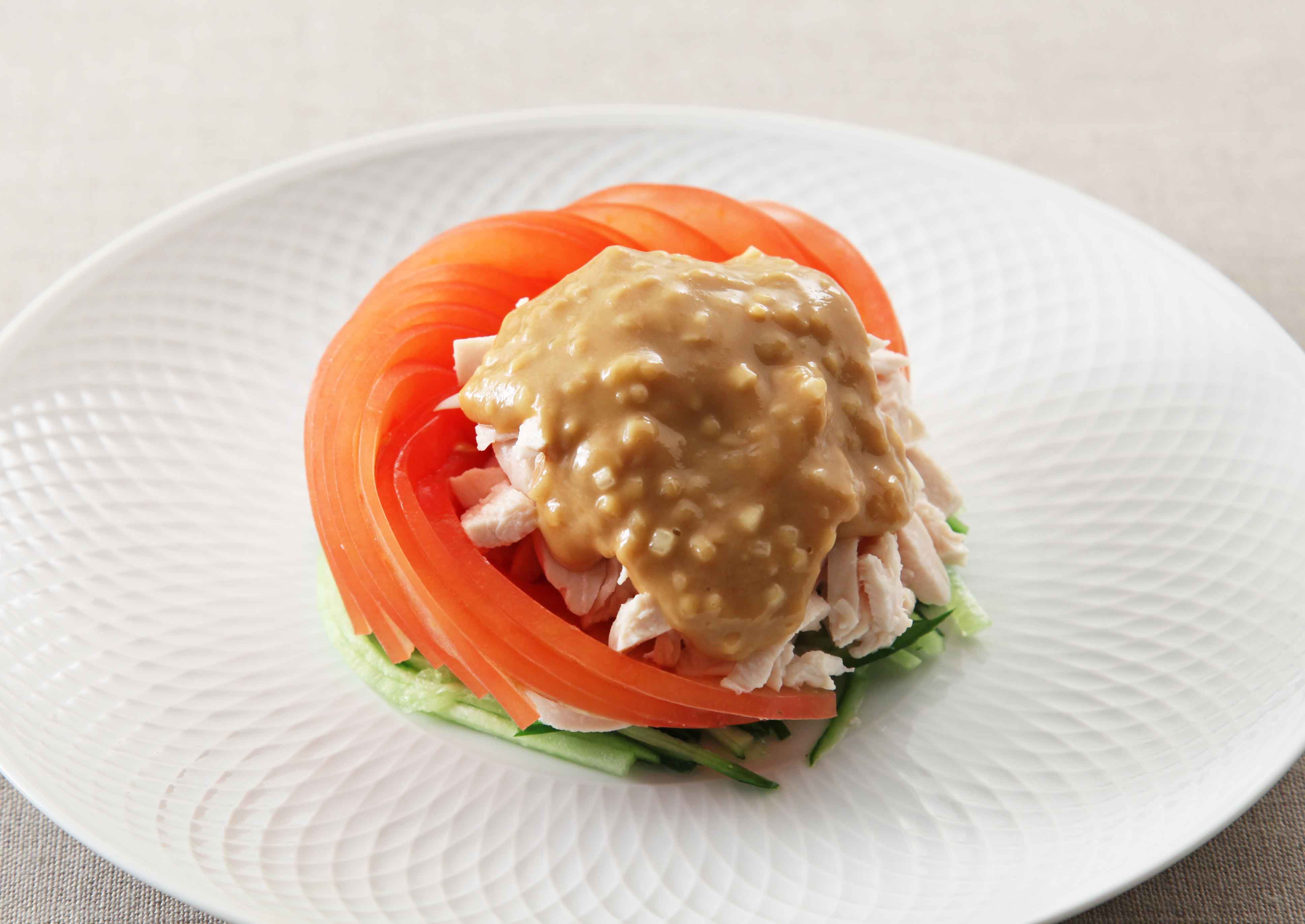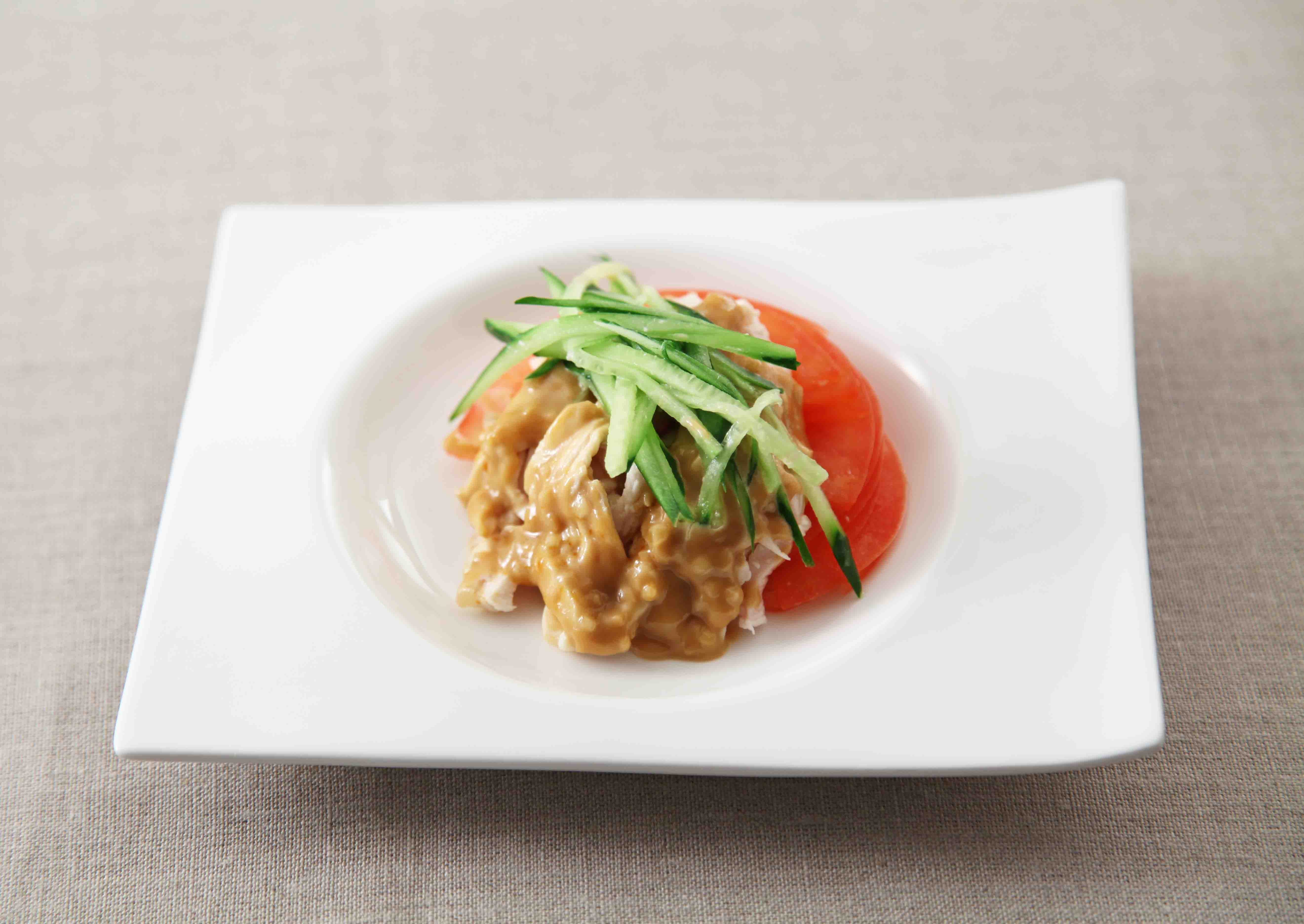 しっとりやわらかな鶏ささみにピリ辛の濃厚ごまダレをかけました。