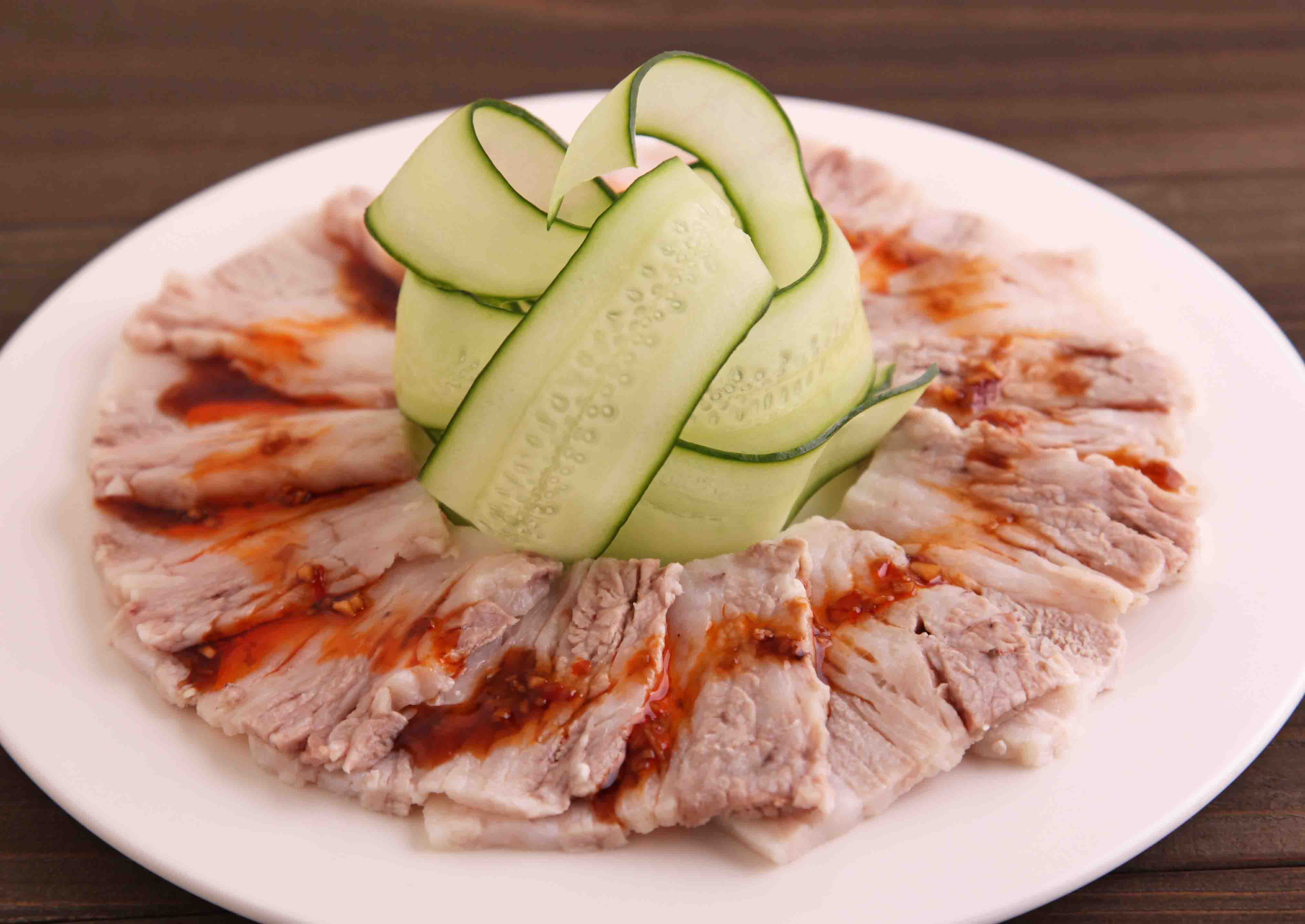 やわらかくなるまで茹でた豚バラ肉にピリッと辛い特製ソースを合わせました。薄切りにしたきゅうりと一緒にいただきます。