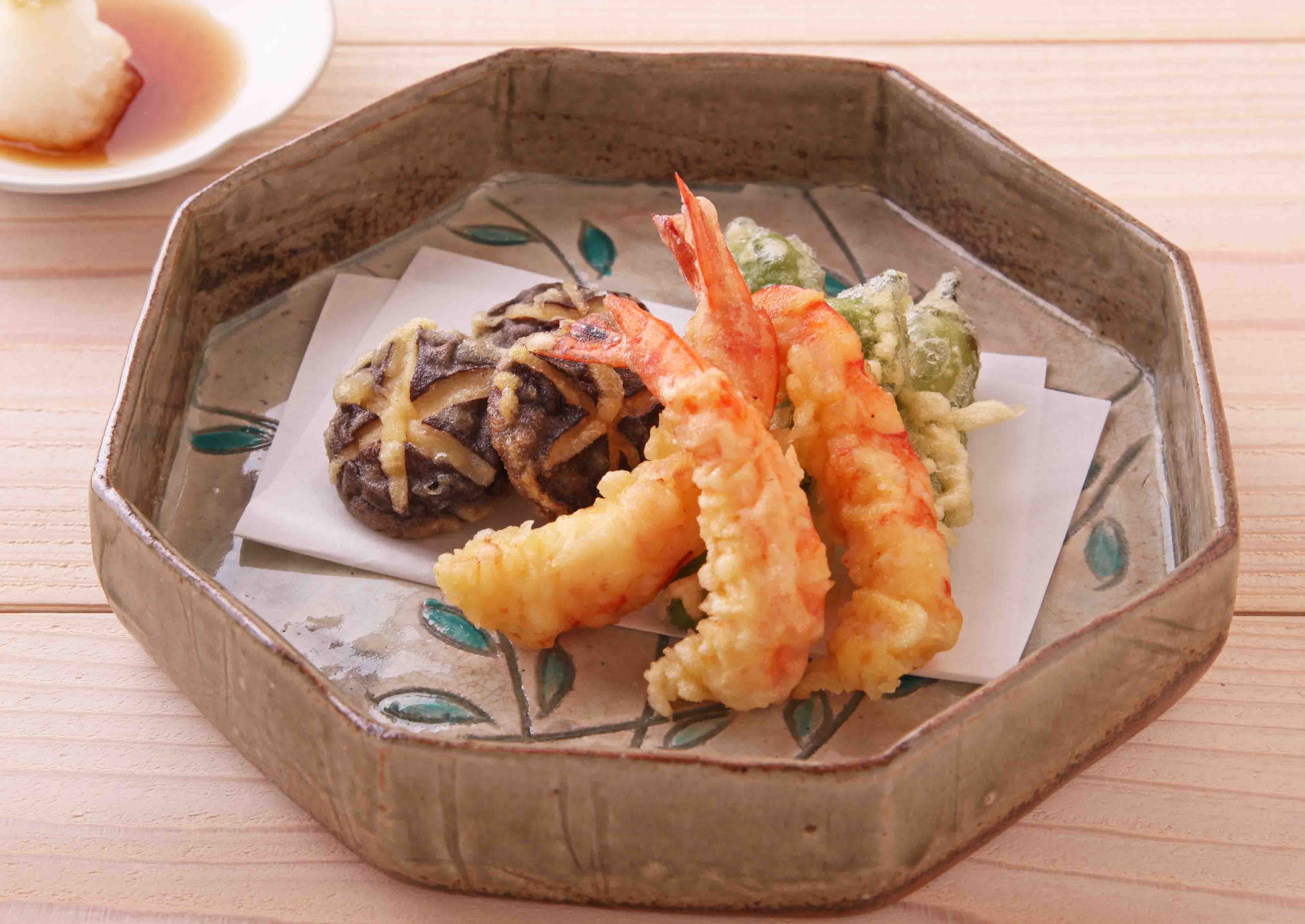 日本料理の基本、天ぷら。今回はえび・しし唐・しいたけをサクッと軽い衣で揚げました。大根おろしや甘さを控えた手作りの天つゆでお召し上がりください。