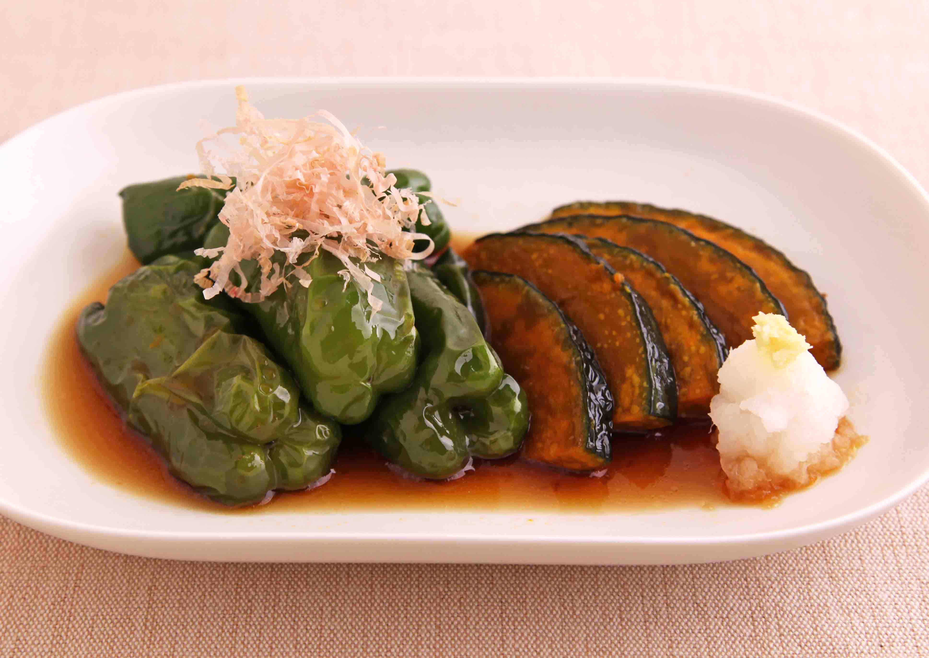 今がおいしいピーマンとほっくり甘いかぼちゃを素揚げし、旨味たっぷりのつゆと合わせました。