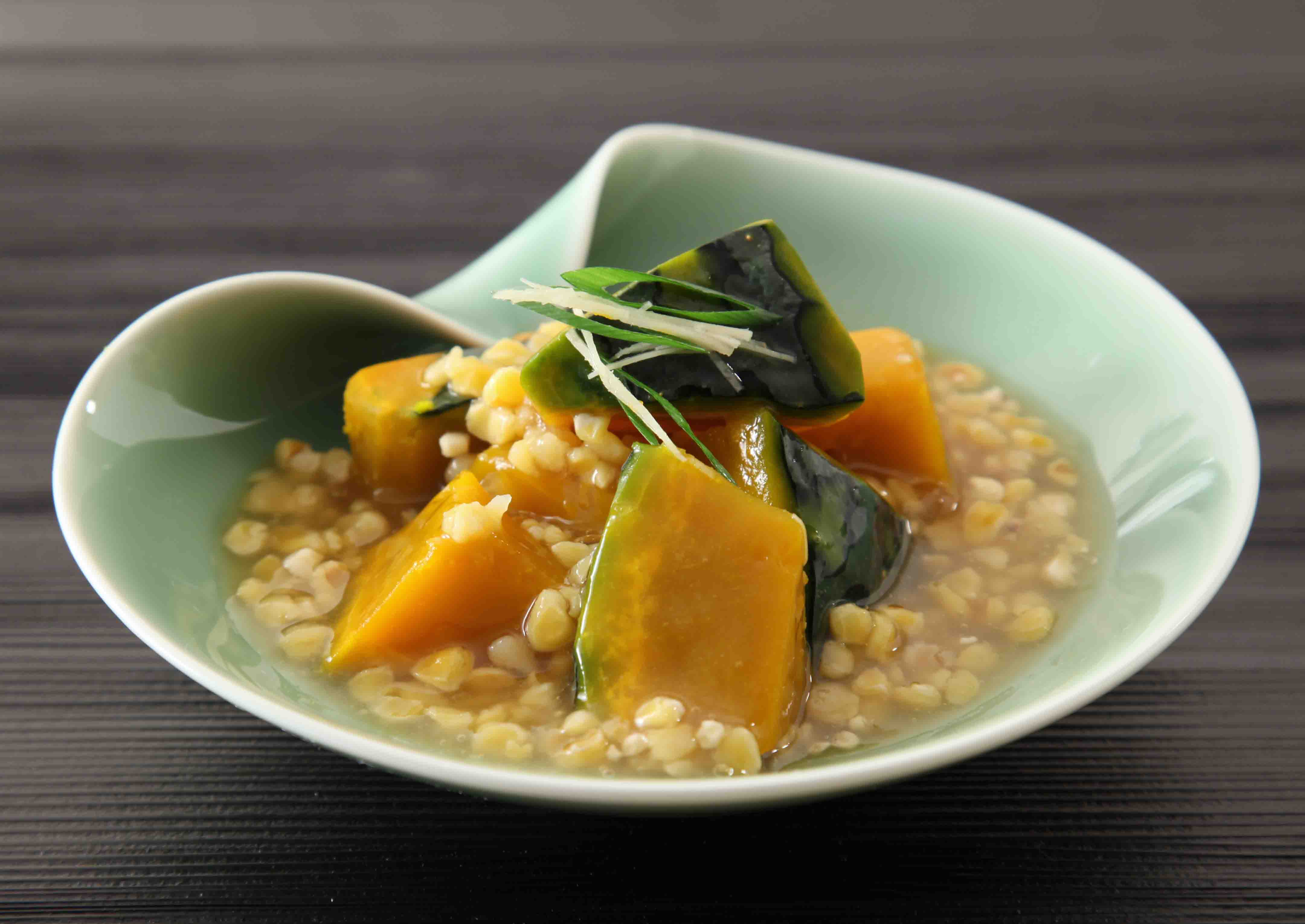 雑穀のとうもろこしを出汁でゆっくりと煮て、ほんのり甘さのあるあんに仕上げました。ほっくりしたかぼちゃにたっぷりかけていただきます。