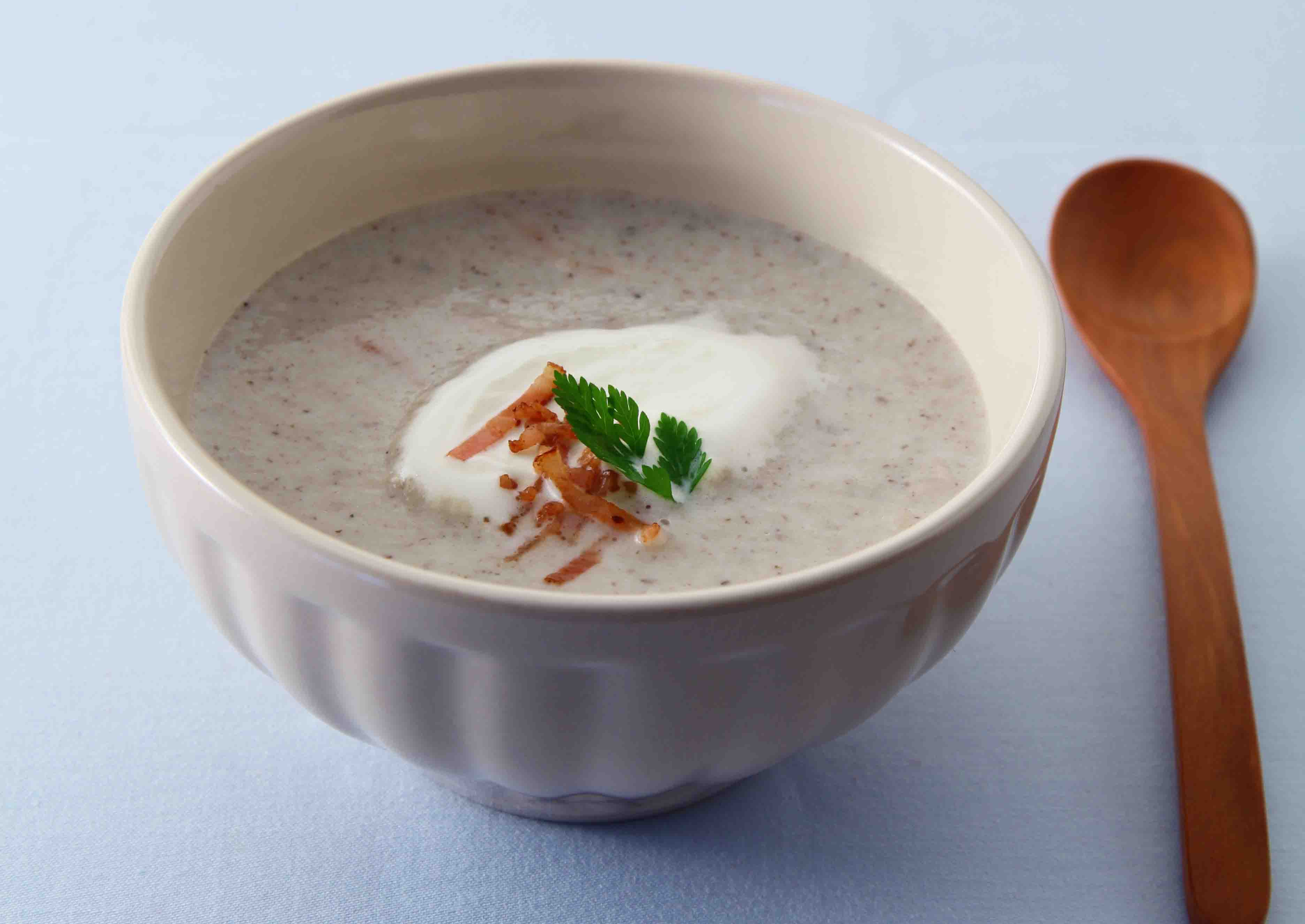 (4)を鍋に戻し入れ、(1)の半量のベーコン・牛乳を加えて温め、残りのバター・塩で味を調える。
