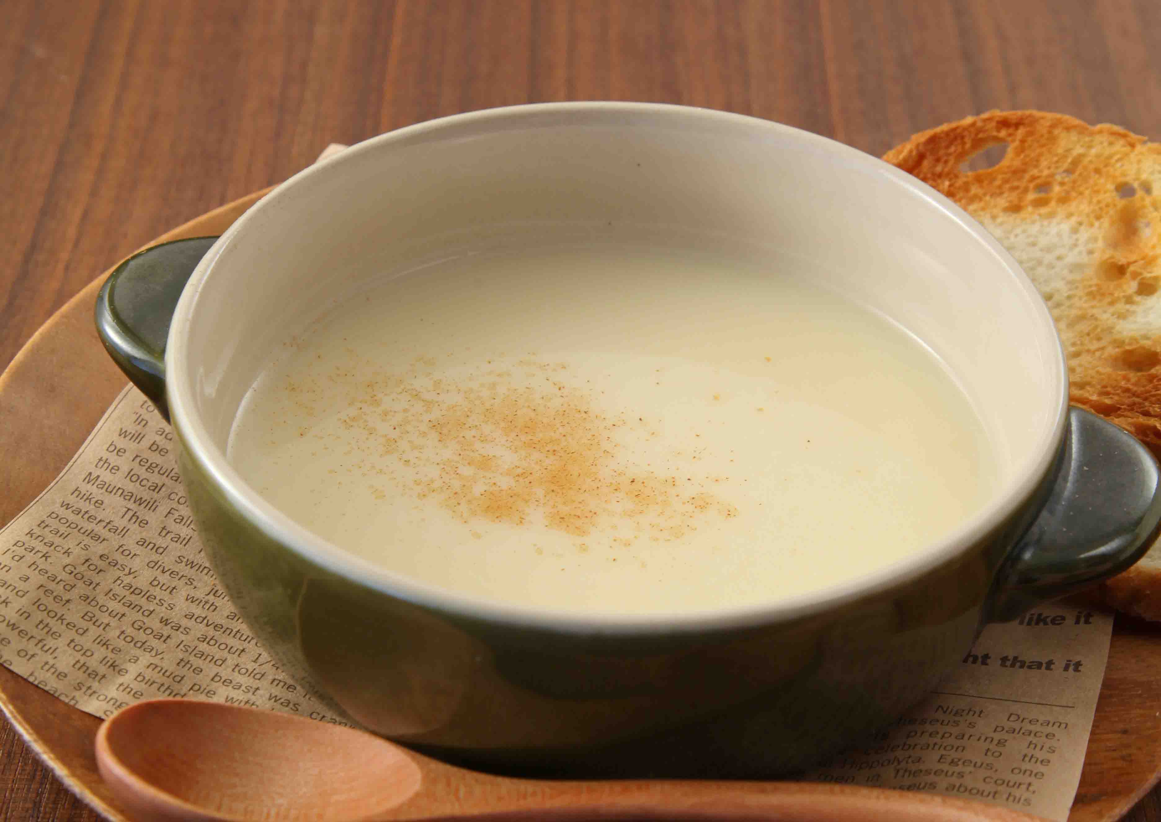 • 牛乳とはちみつを加えて温め、塩で味を調える。器に盛り、お好みでシナモンを振り、バゲットと一緒にいただく。