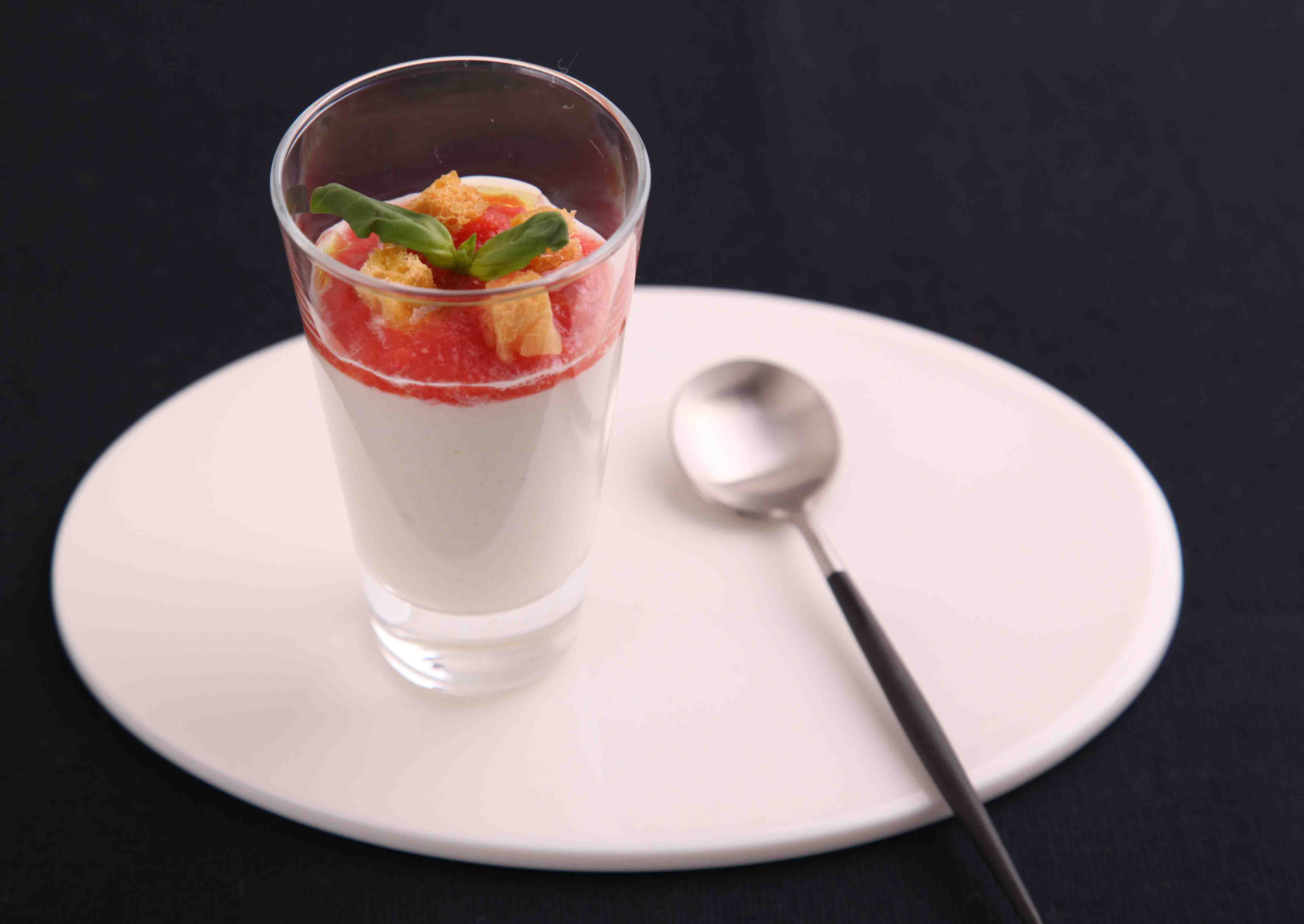 ねぎをしっかり炒めてから煮込んで甘みを引き立たせ、牛乳・生クリームと合わせなめらかなムースにしました。ほどよい酸味と自然な甘みがある、トマトのピュレと合わせていただきます。