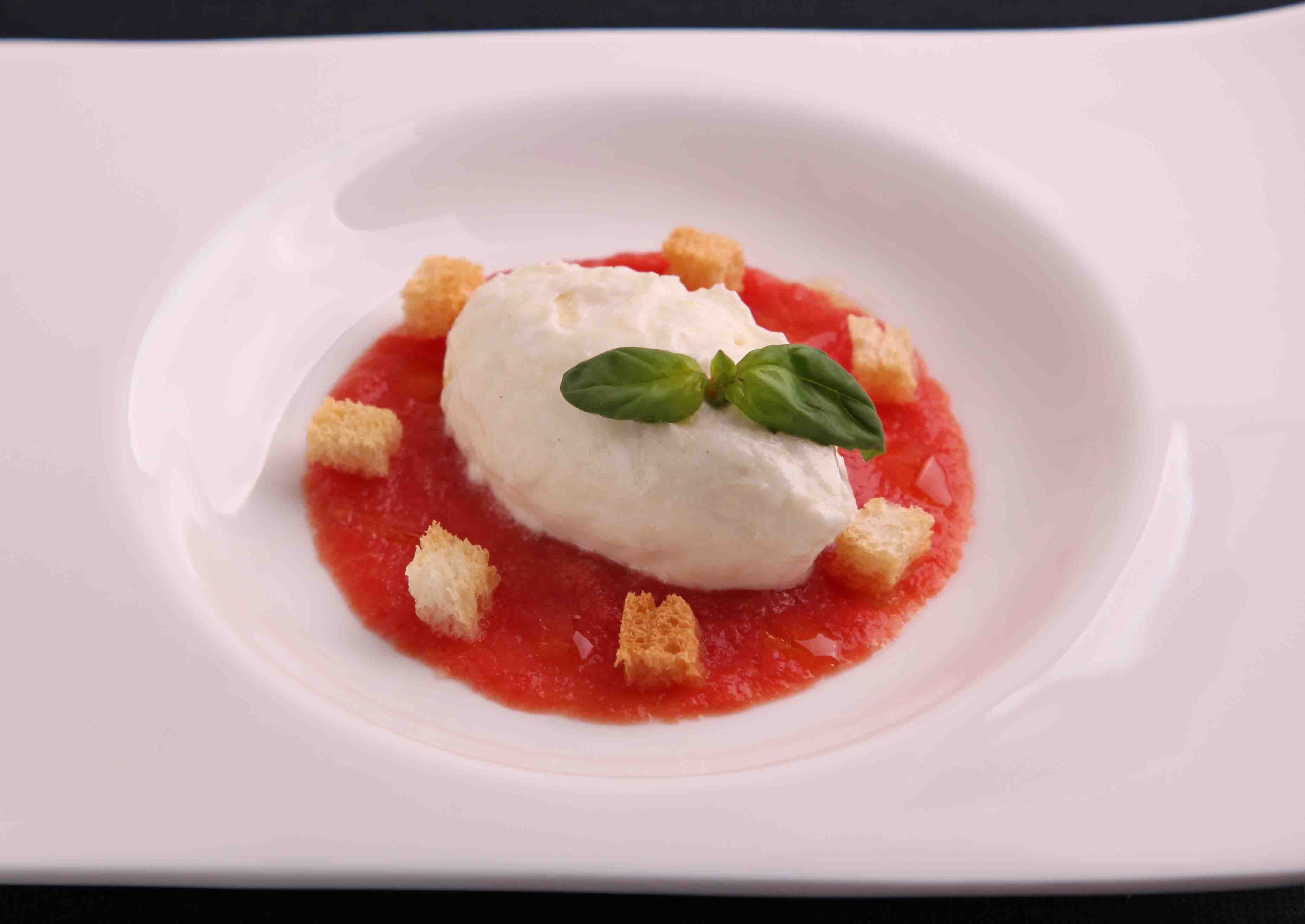 (4)のムースの上に(5)のトマトのピュレをのせ、バジル・クルトンを飾り、オリーブオイルを垂らす。