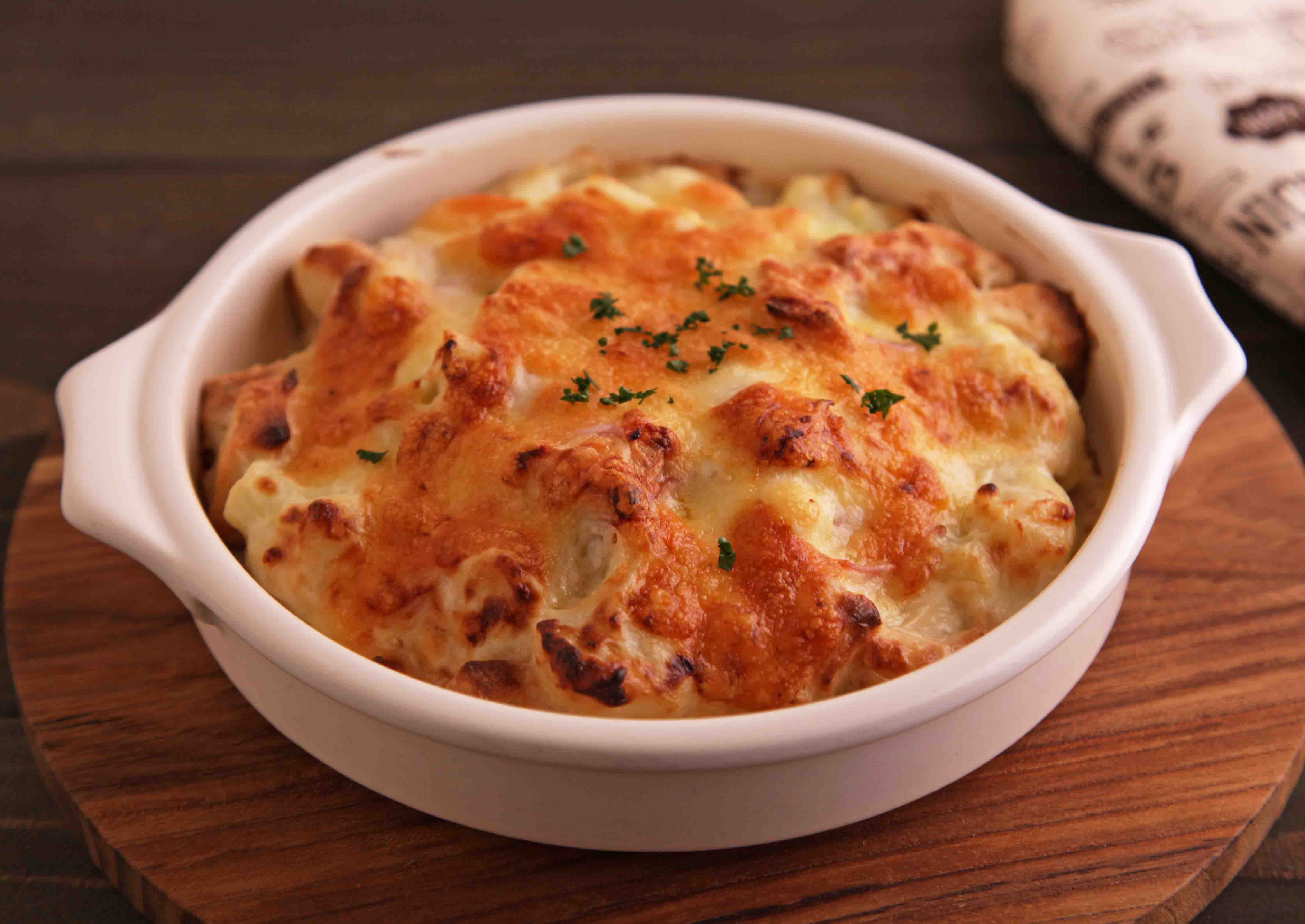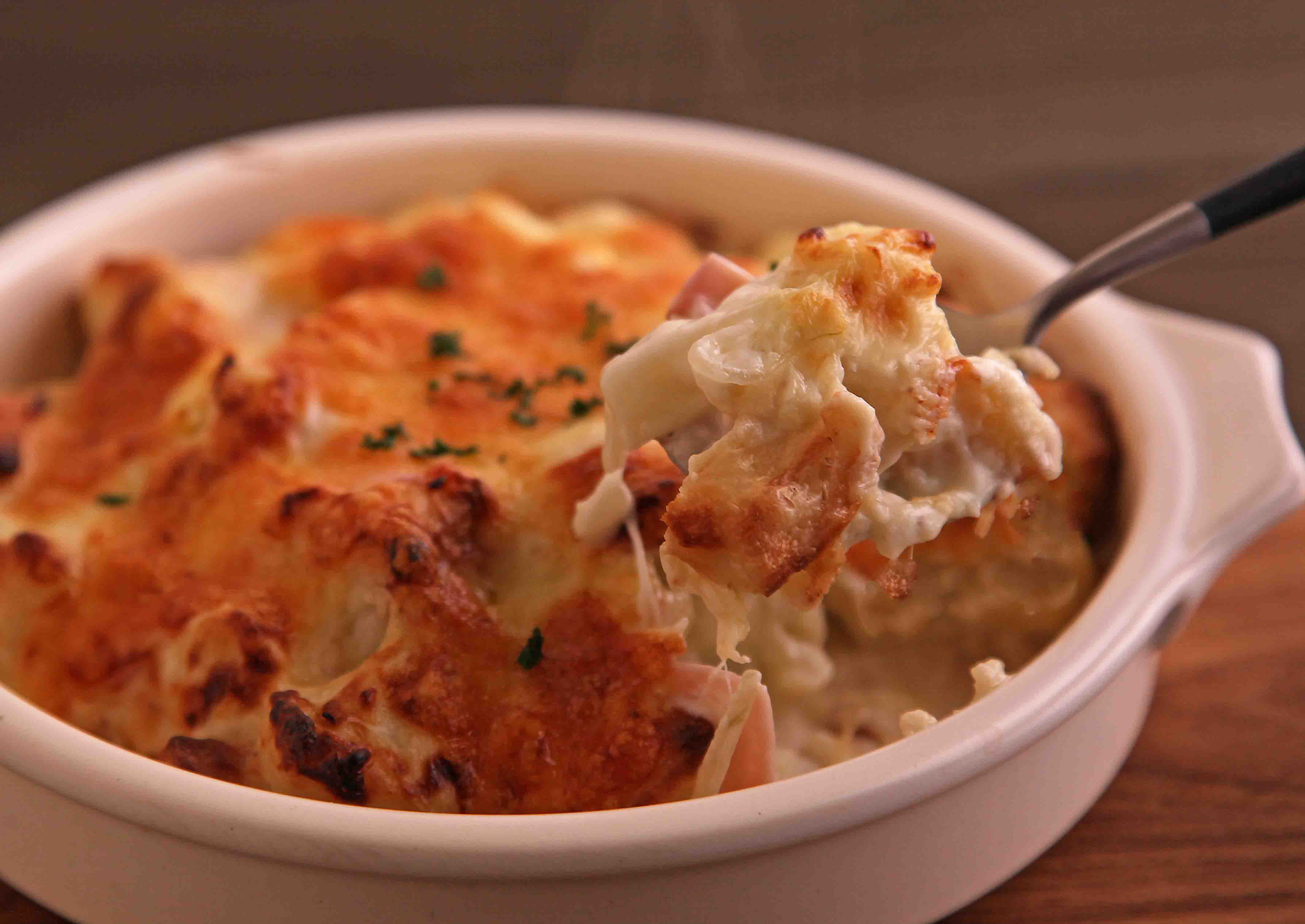 クリーミーなホワイトソースに香ばしく焼いたカリフラワーと食パンが入ったグラタンです。
