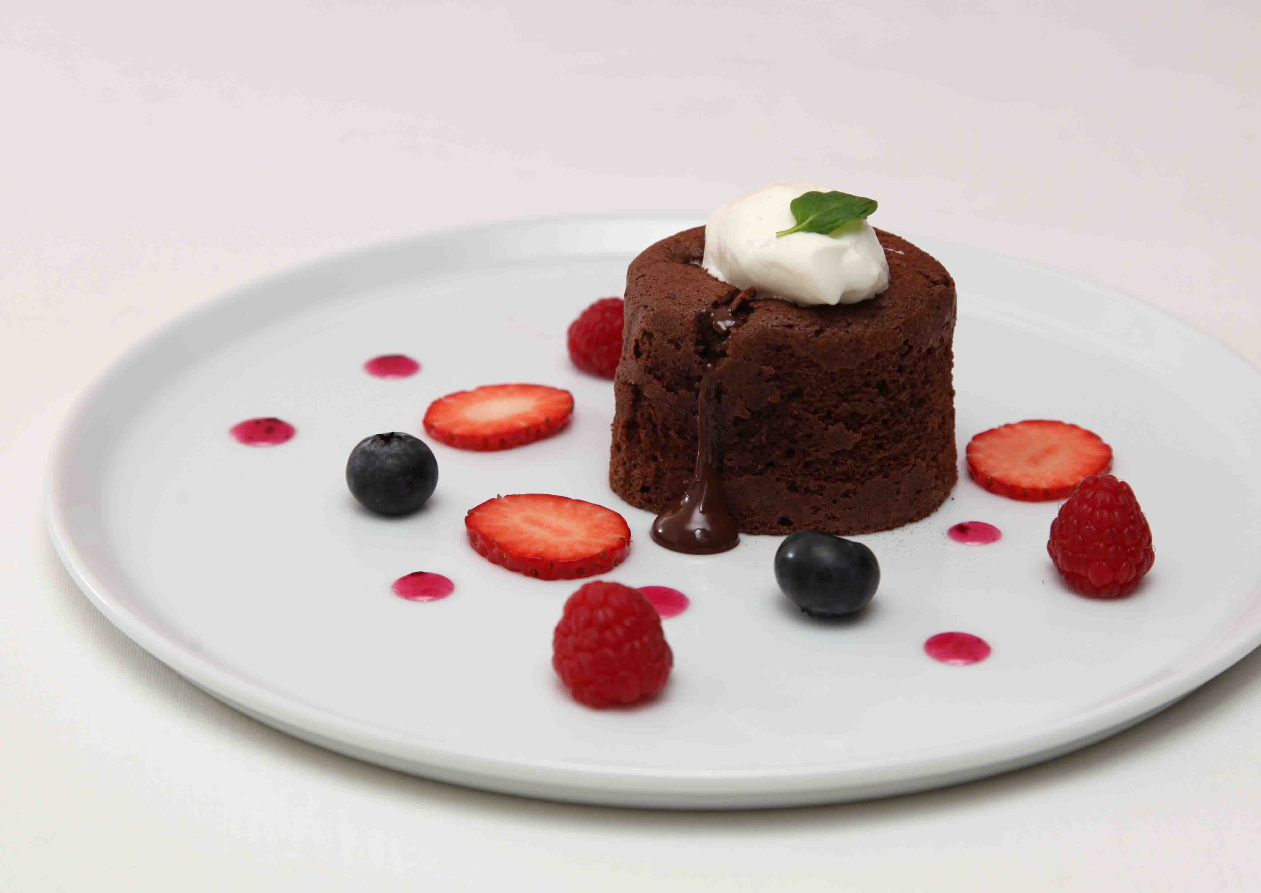 温かなチョコレートケーキの中から洋酒香るチョコレートがトロリとあふれ出ます。