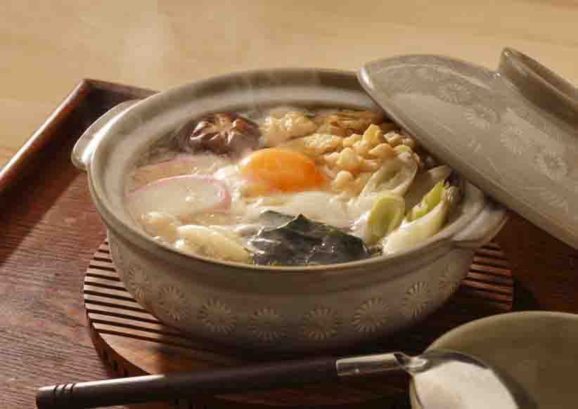 具材たっぷり、出汁香る熱々鍋焼きうどん。うどんは消化にもよく、夜食にもぴったりです。
