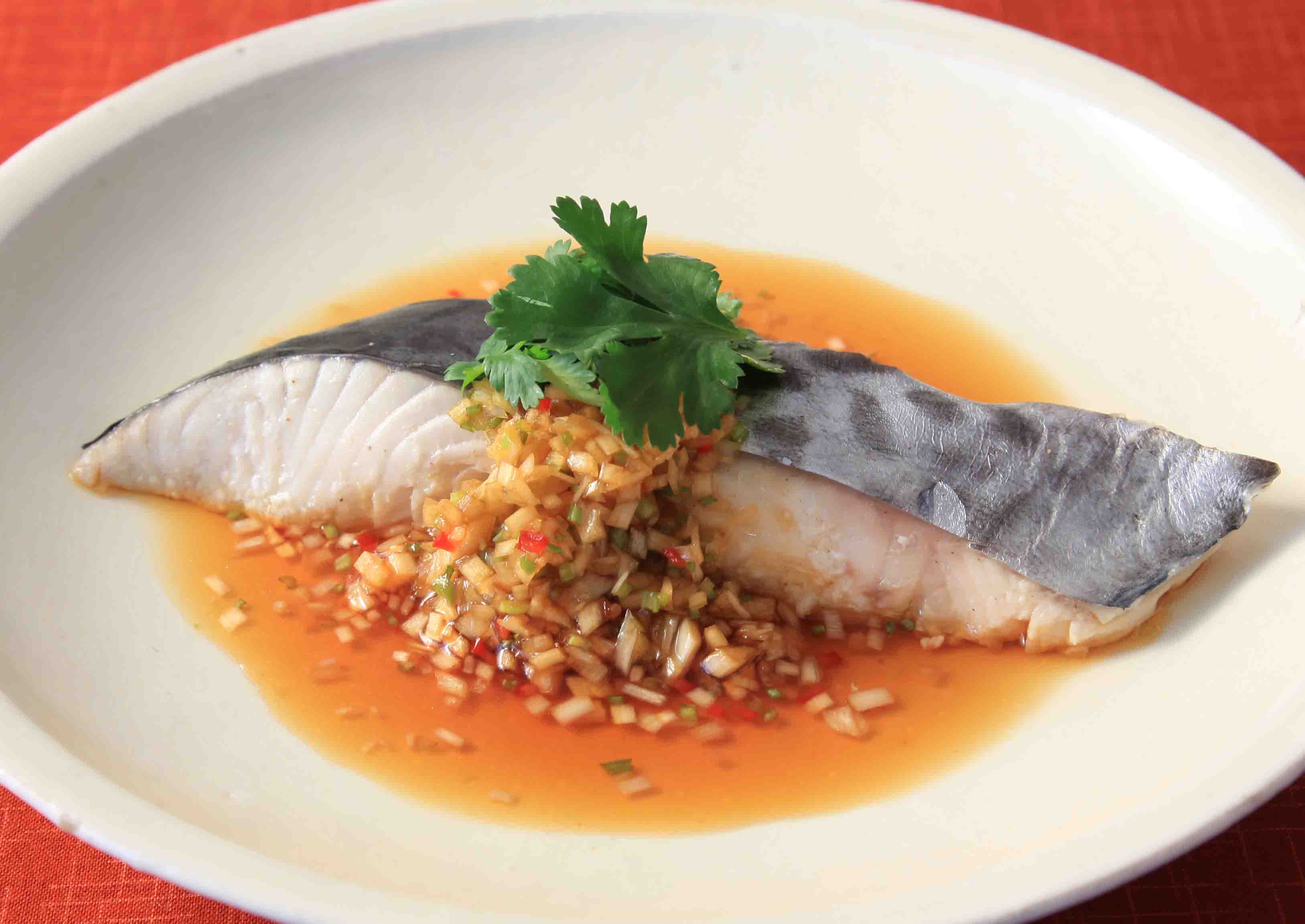ふっくらと蒸し上げたさわらに、ごま油香る甘酸っぱいねぎソースをたっぷりかけました。