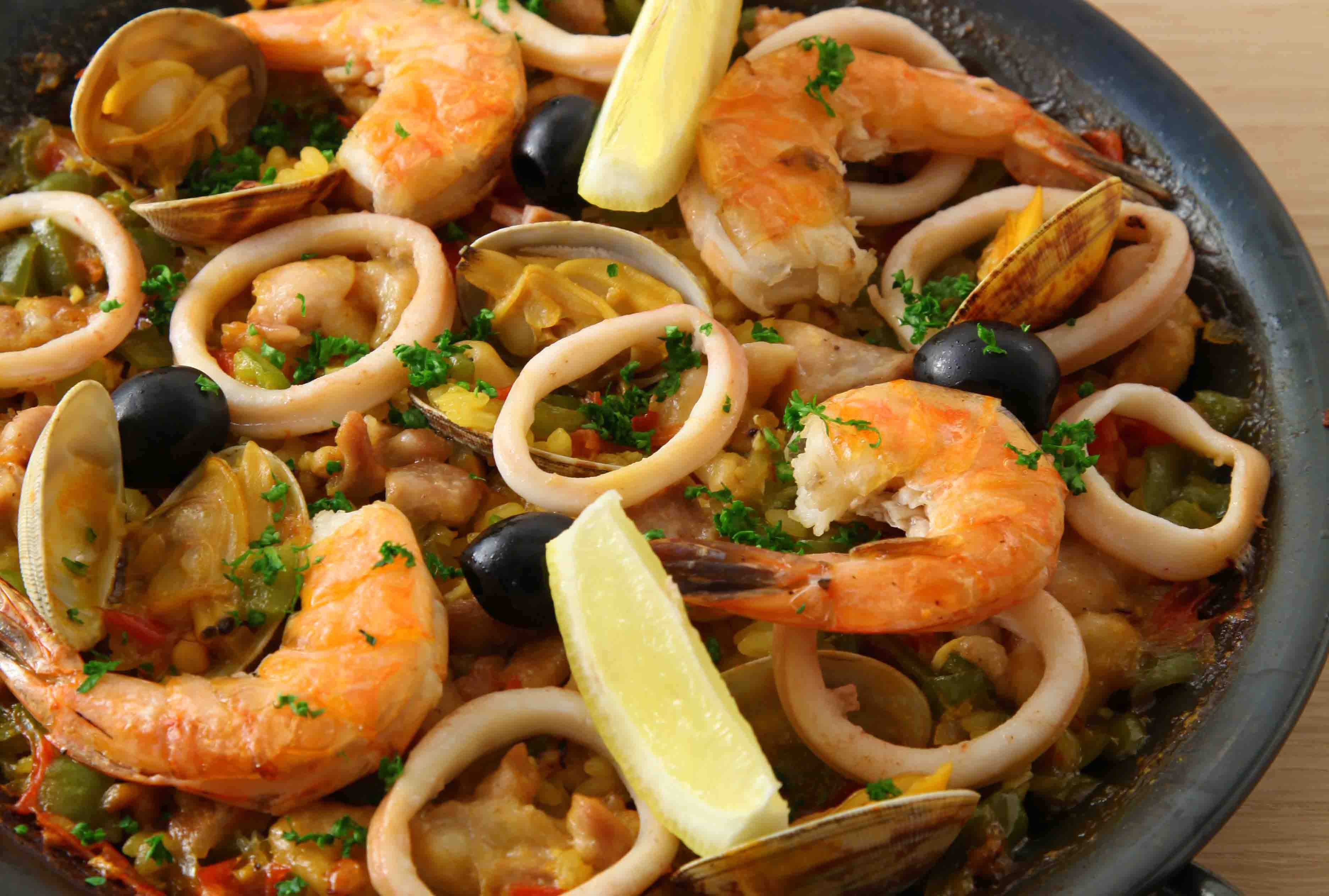 米に魚介と鶏肉のうま味がたっぷり染みた、見た目も華やかなパエリアです。