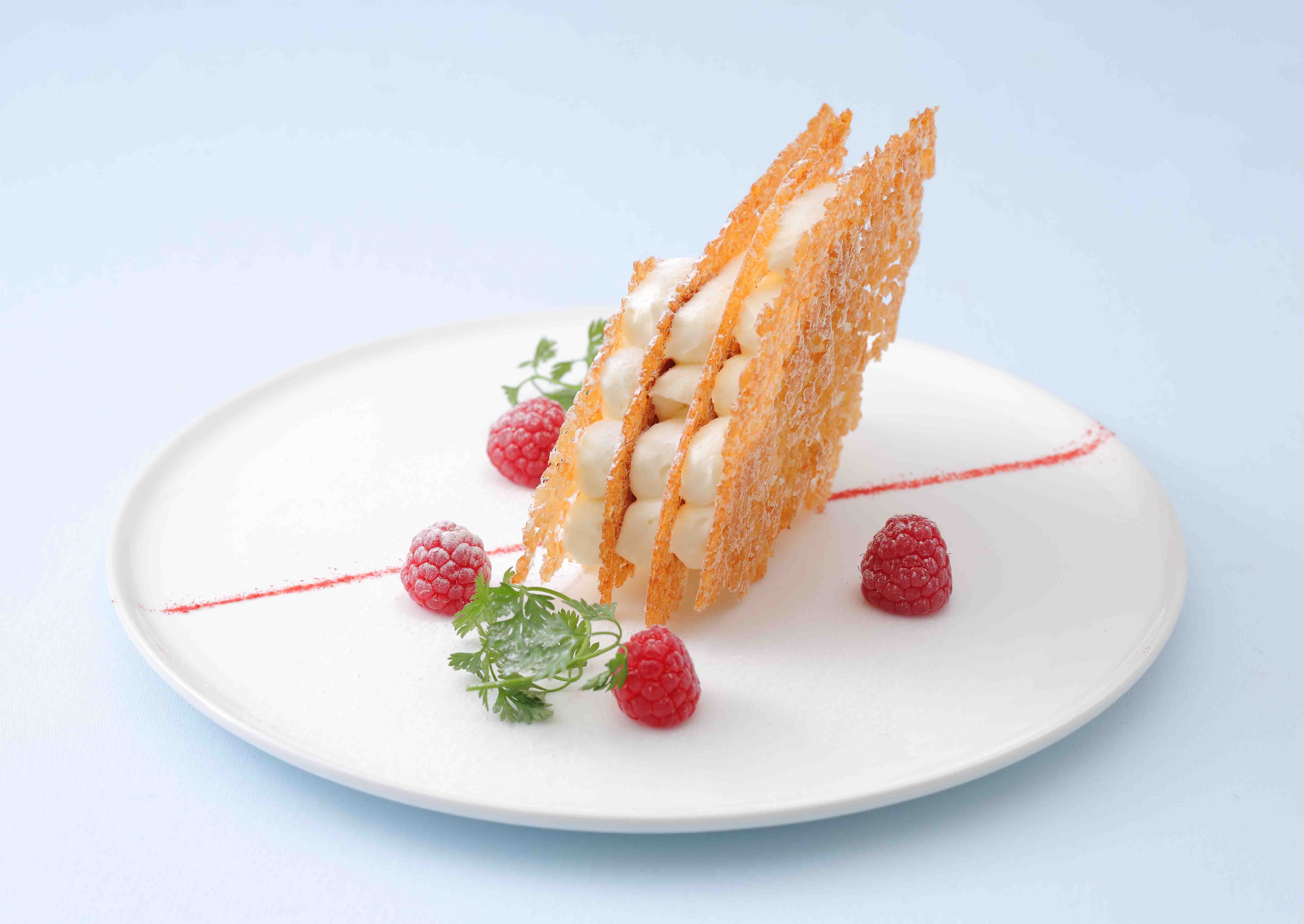 ごはんとグラニュー糖で作るパリッと香ばしいチュイールに、甘酸っぱいベリーとチーズクリームを合わせました。