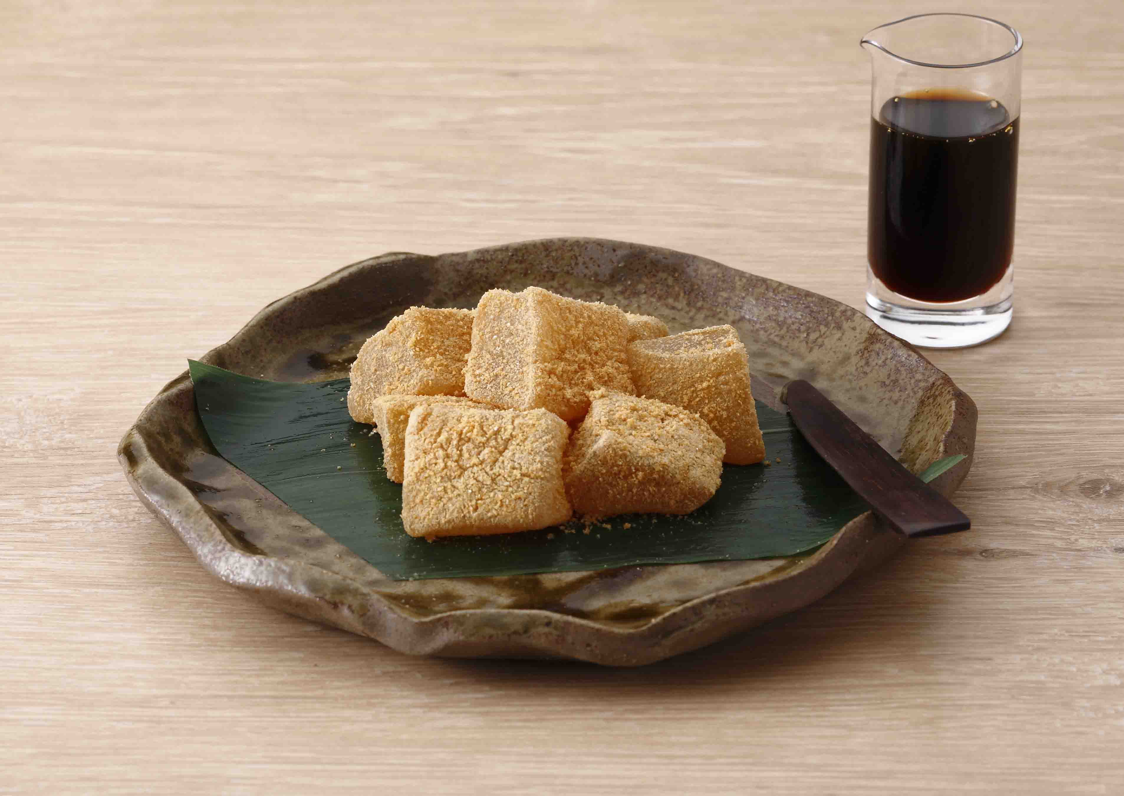 まな板に合わせたBのきな粉を振って(5)をのせ、さらに上からきな粉を振り、食べやすい大きさに切る。残ったきな粉をたっぷりとまぶし、器に盛り付け、黒みつをかけていただく。