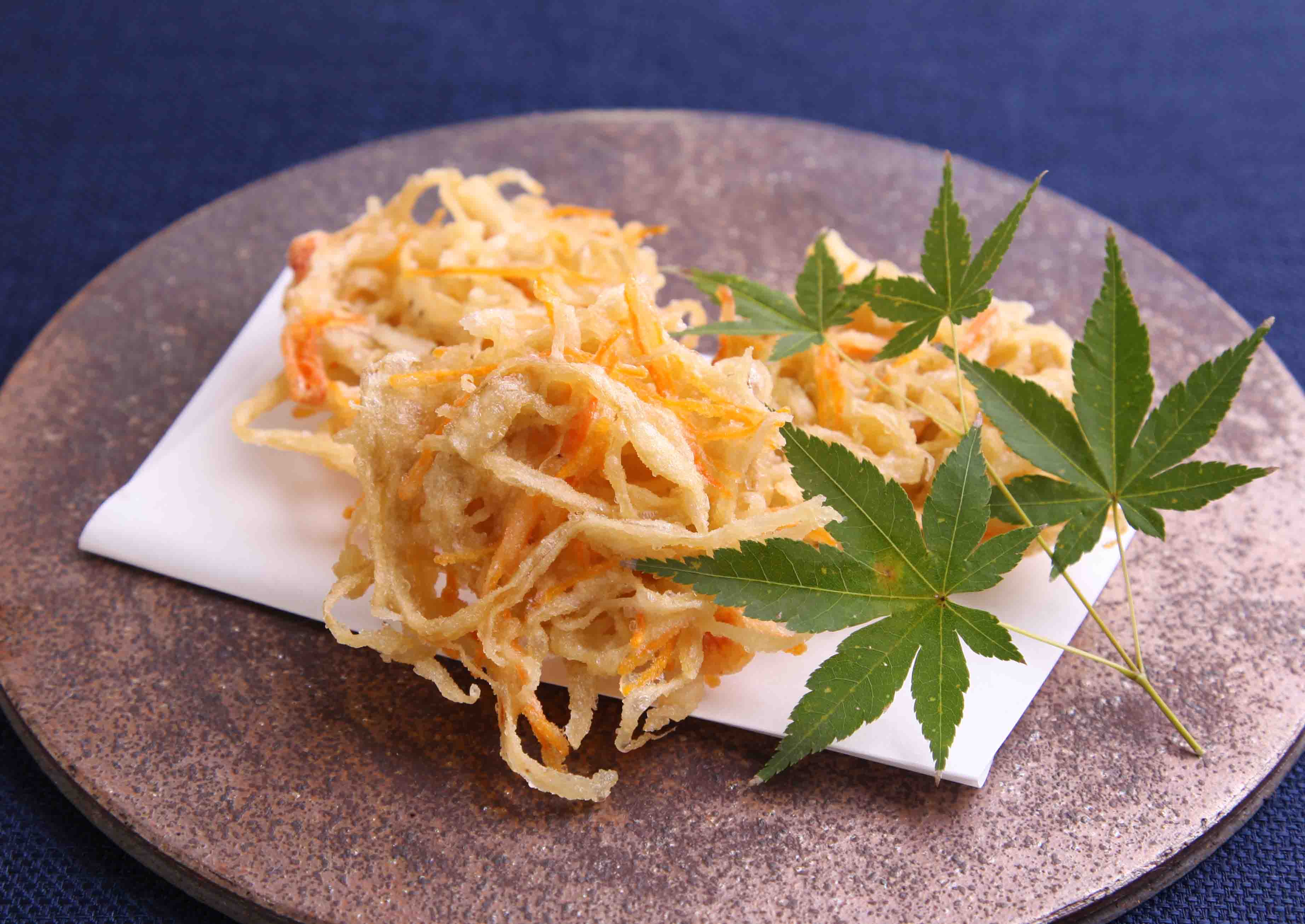 薄くささがきにしたごぼうと、人参・桜えびを合わせてサクッと揚げました。ごぼうと桜えびのカリッとした食感とこうばしい香りが楽しめます。