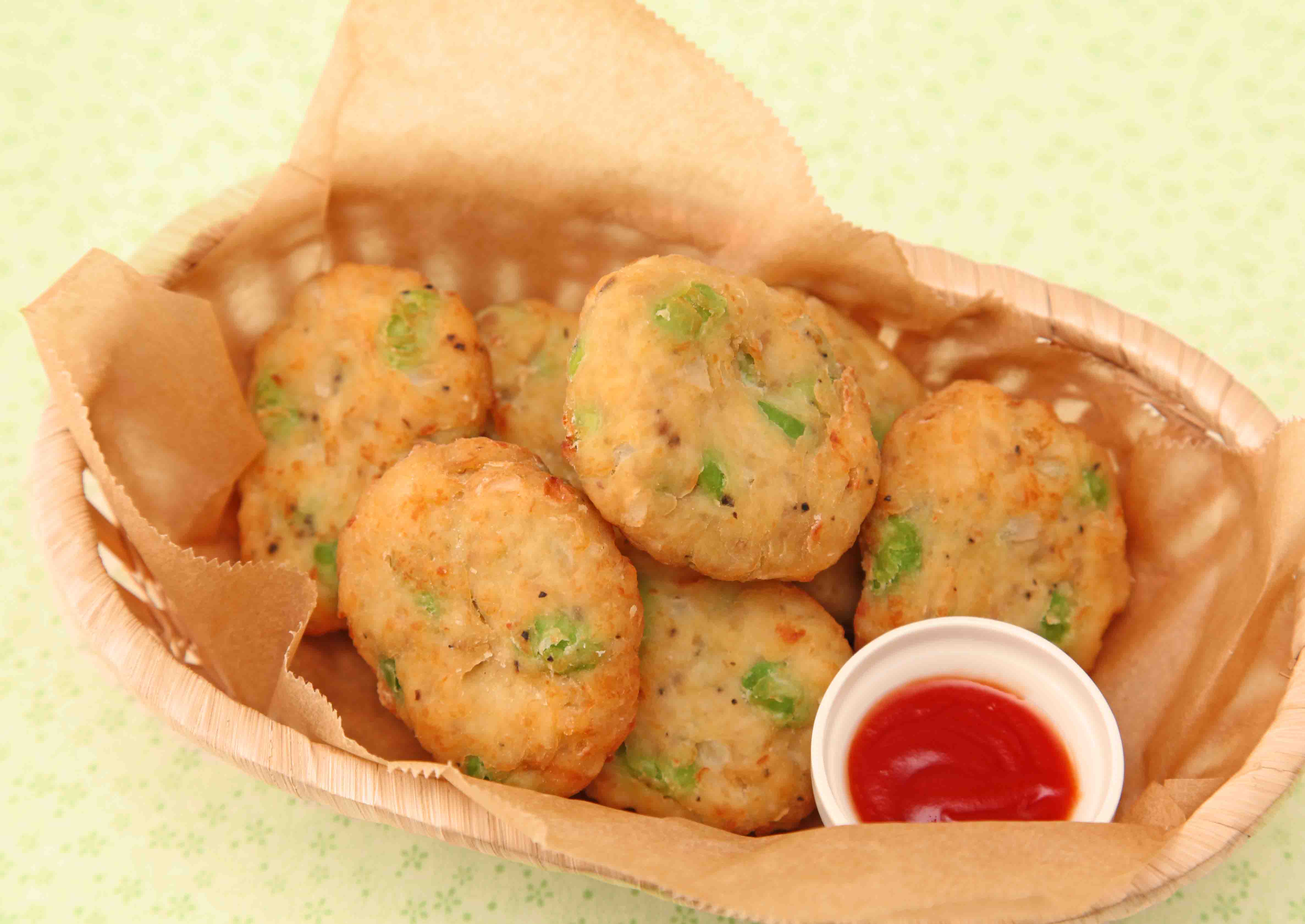 • (3)の表面に合わせたBを薄くまぶし、180℃の揚げ油で表面がカリッときつね色になるまで揚げる。