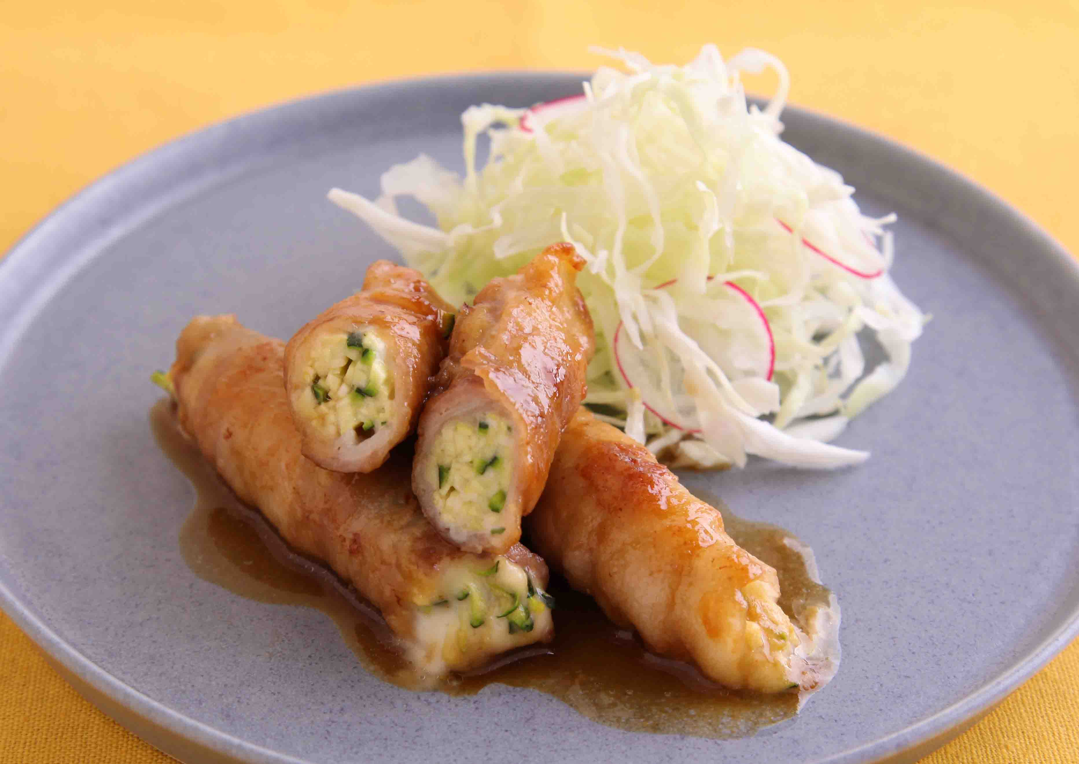 旨味たっぷりの豚バラ肉で細切りのズッキーニを巻き、甘辛い照り焼きのタレを絡めました。