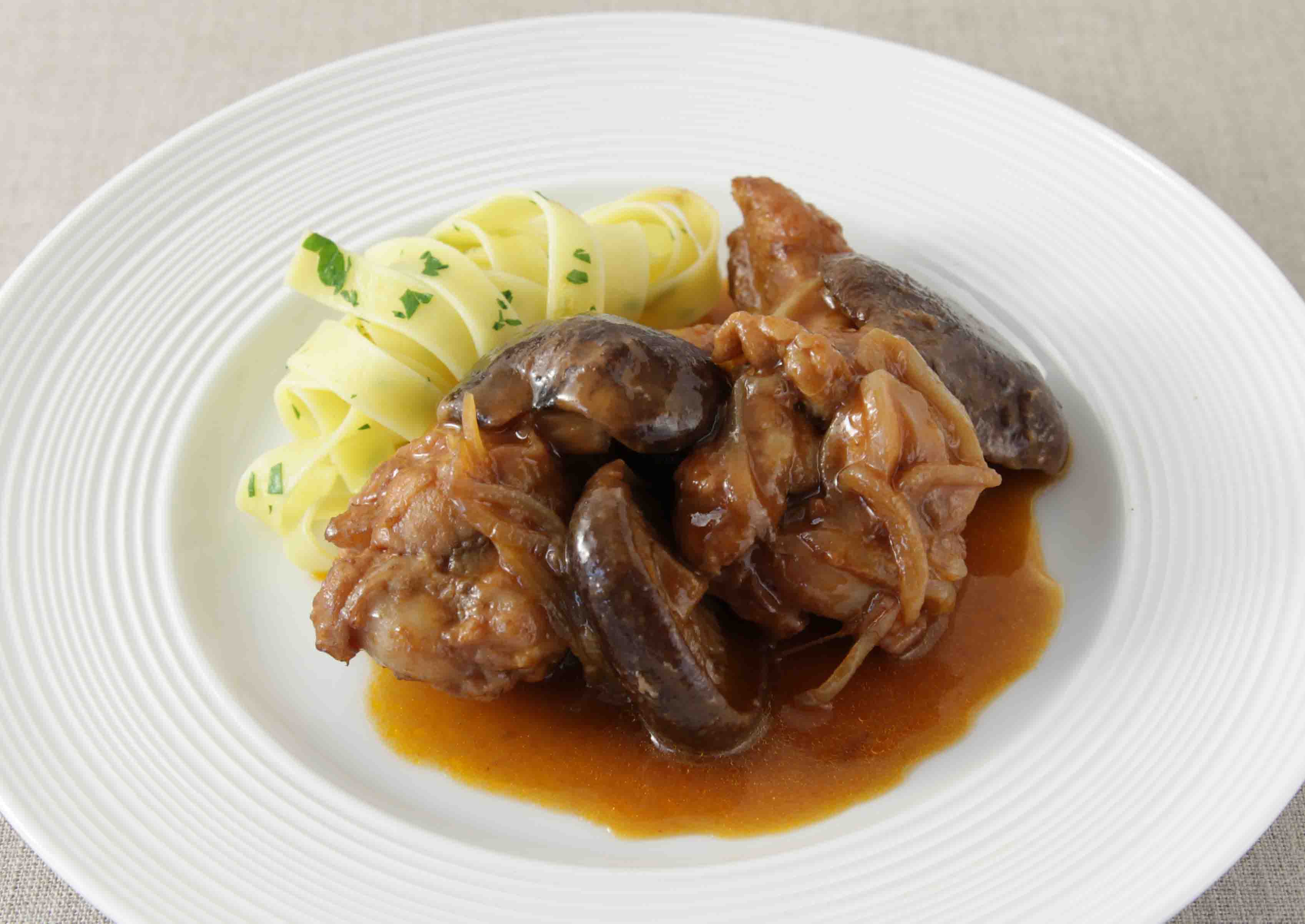和食で使うことの多い干ししいたけを鶏手羽と一緒にワインで煮込み、洋風に仕上げました。