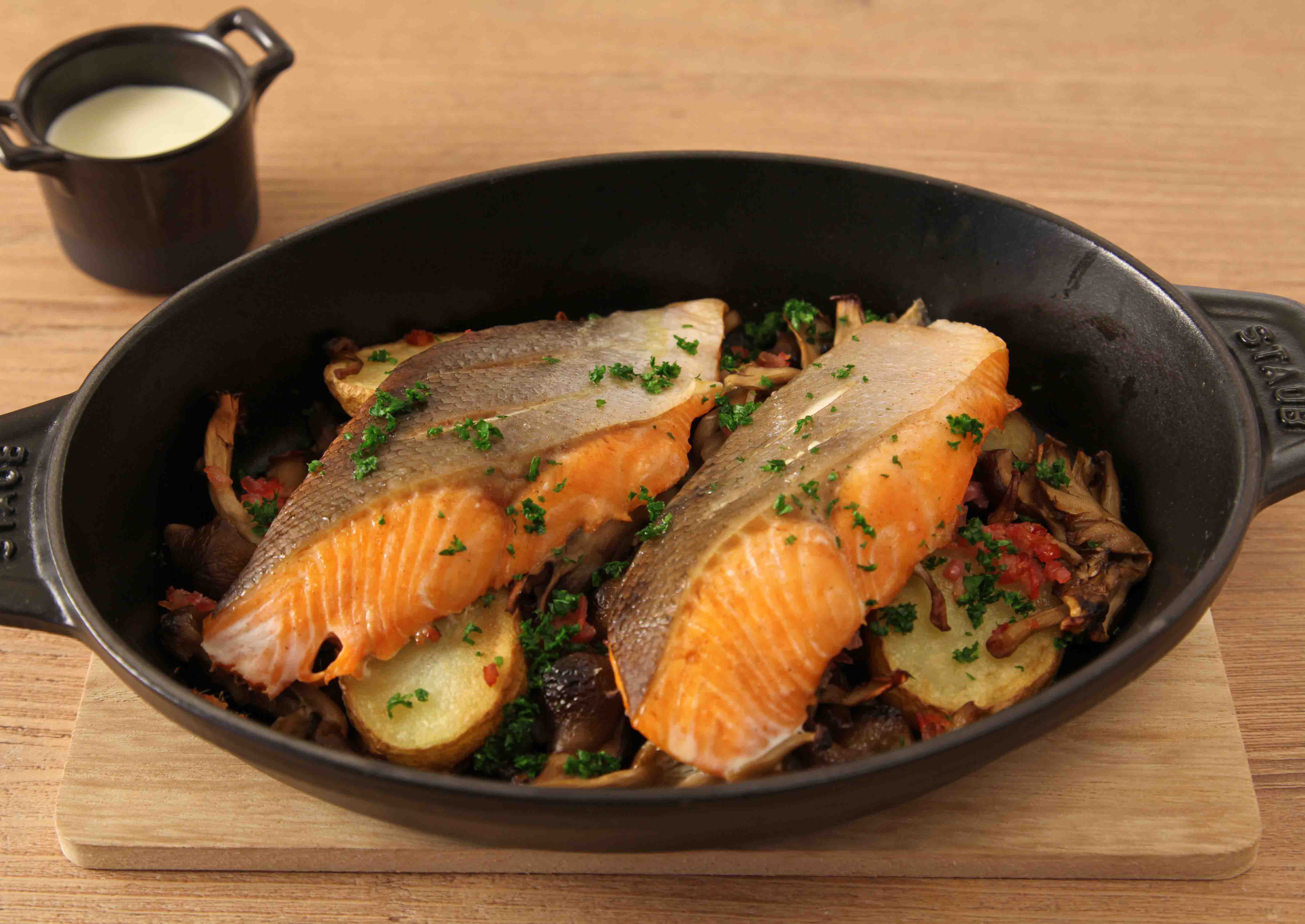 • 残りのオリーブオイルを全体にかけて200℃のオーブンで15~20分焼く。焼き上がったらパセリを散らし、お好みで混ぜ合わせたアイオリソースをつけていただく。