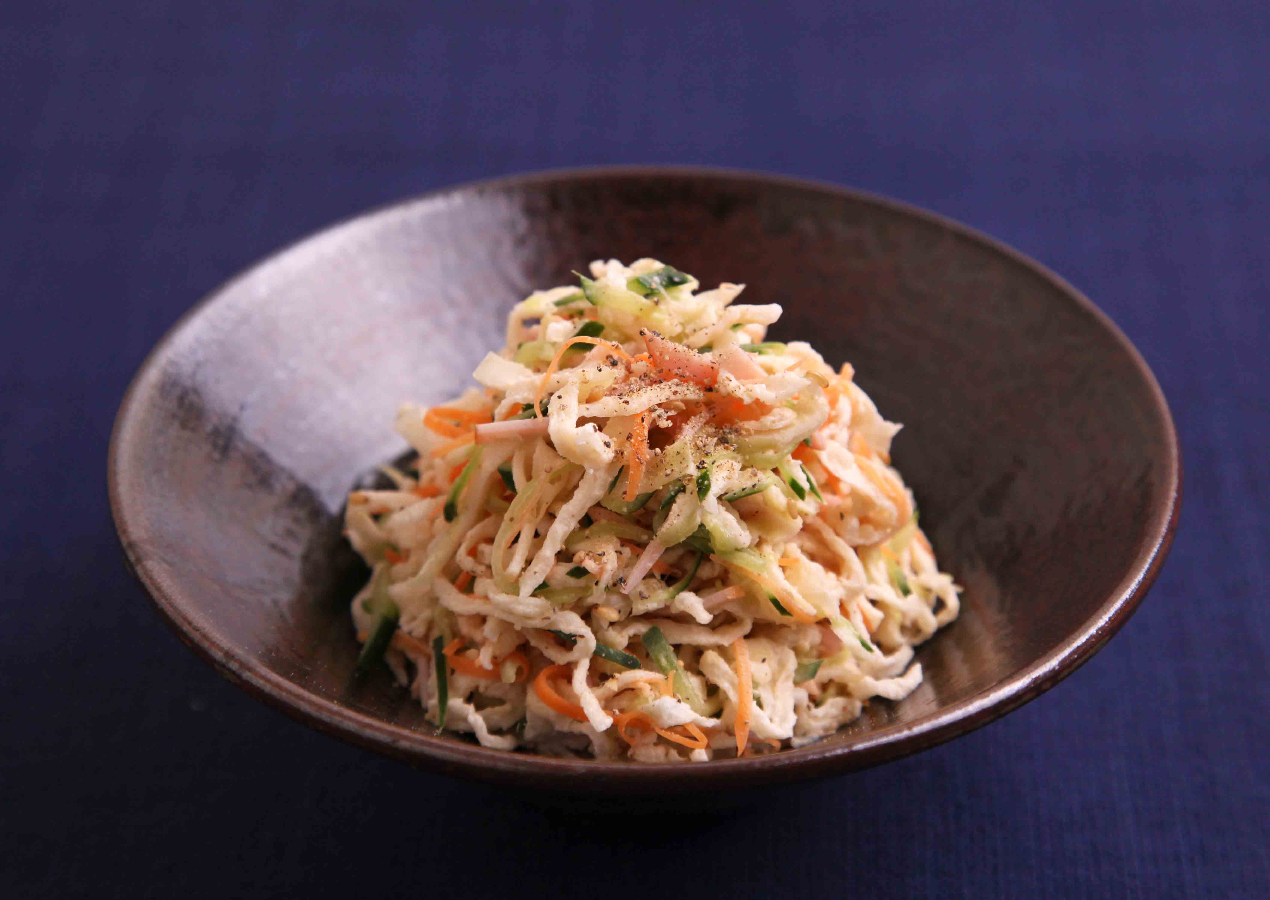 煮物のイメージが強い切り干し大根ですが、サラダにするとシャキシャキの食感が楽しめます。甘酢を絡めた切り干し大根はマヨネーズとの相性がよく、ごまの風味がアクセントに!