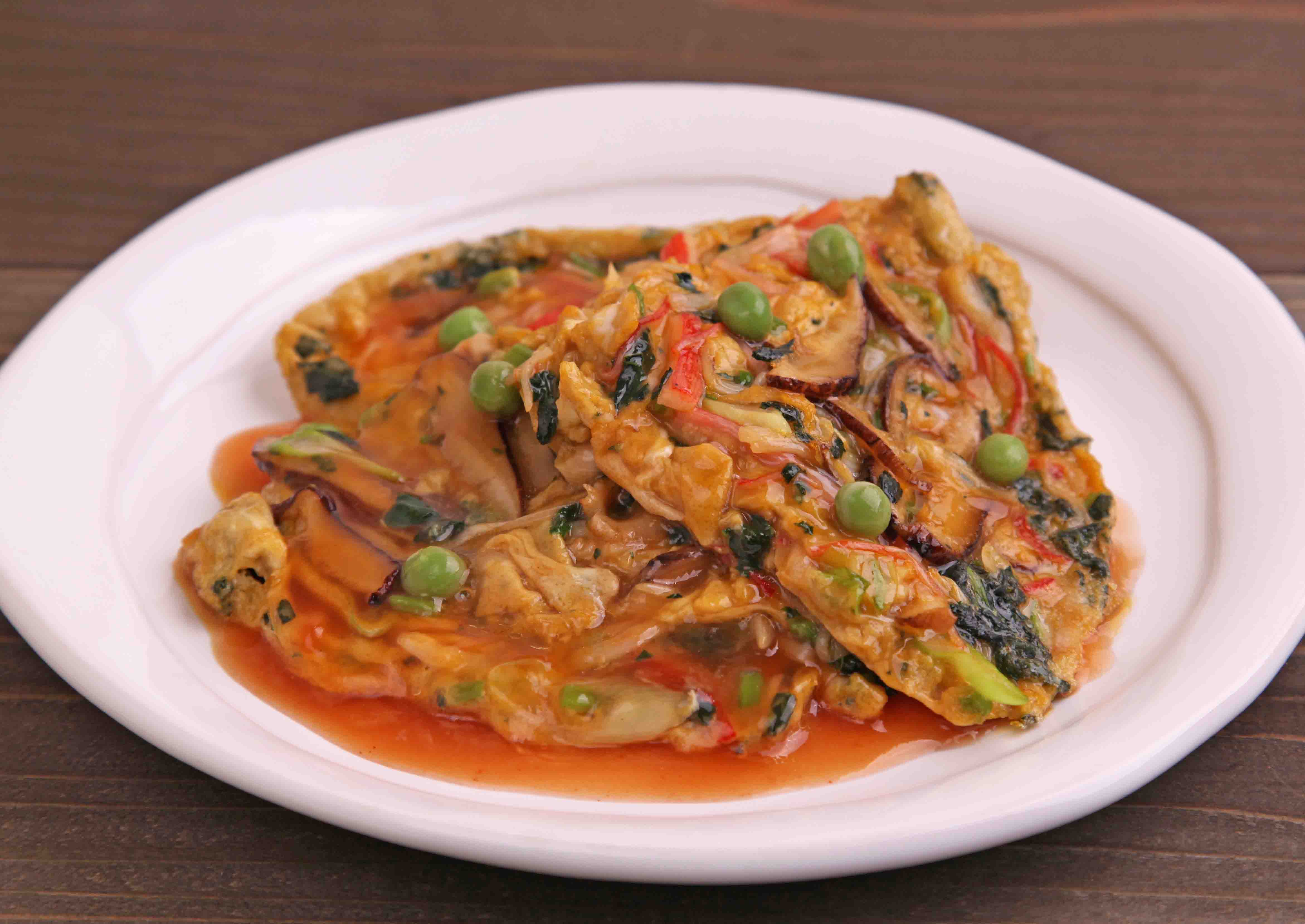 特有の粘りが特徴のモロヘイヤは今が旬。刻んだモロヘイヤを卵に混ぜてふんわりと焼き上げました。甘酸っぱいケチャップあんをかけていただきます。