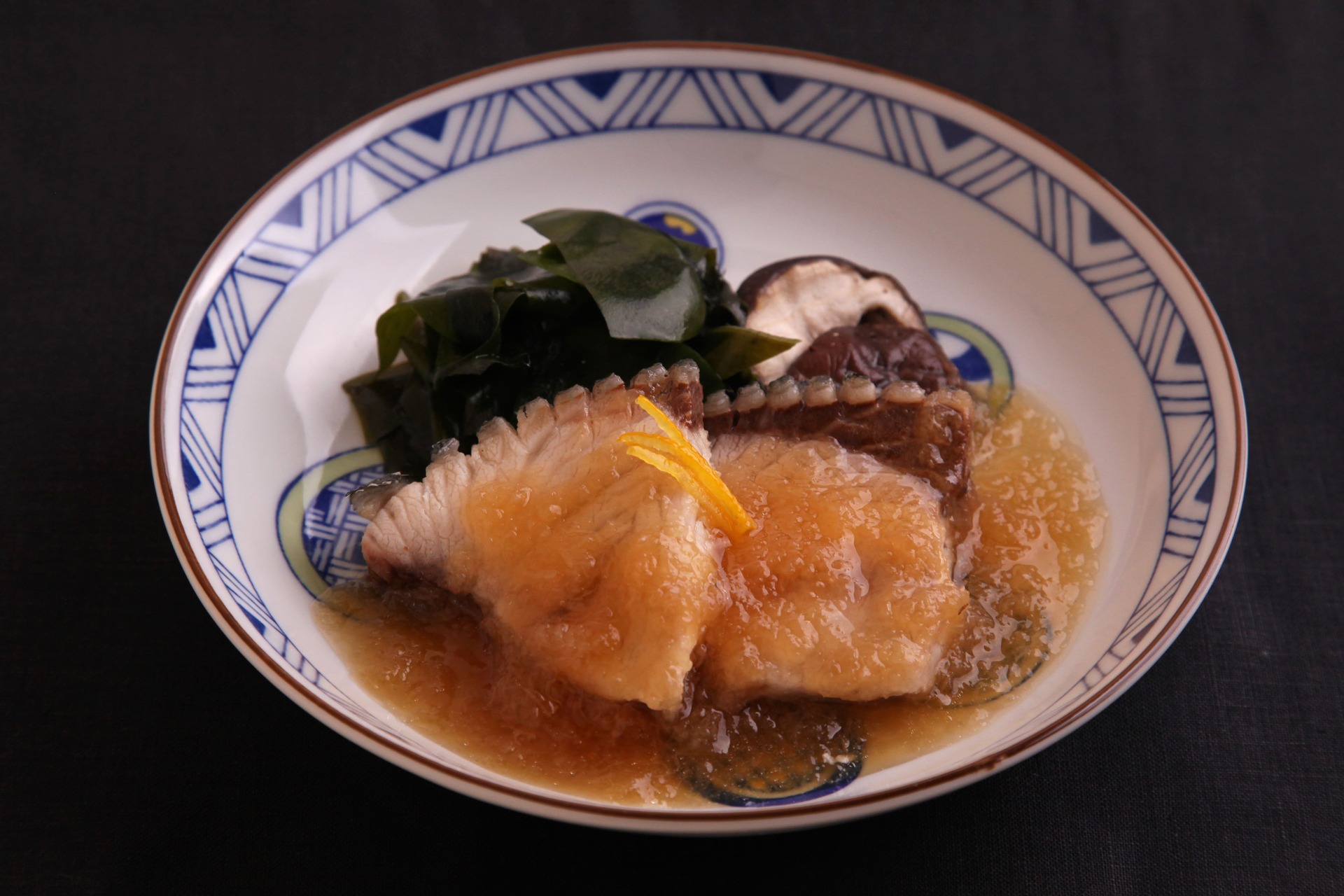 ※ぶりやしいたけの旨味たっぷりの蒸し汁もおろしあんに加えると、味にグッと深みが出ます。(3)に(4)のおろしあんをかけ、黄ゆずの皮をのせる。