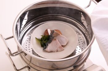 蒸気の上がった蒸し器に入れ、フタをして強火で4~5分蒸し、ぶりに火が通ったら取り出す。