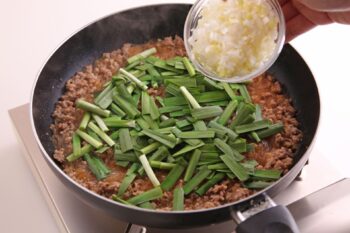 • フライパンにサラダ油・にんにく・しょうがを入れて弱火で熱し、香りがしてきたら挽き肉を入れて
