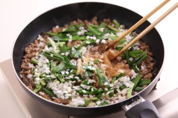 • 春雨にしっかり火が通ったら、(1)の長ねぎ・にらを入れて炒め合わせる。