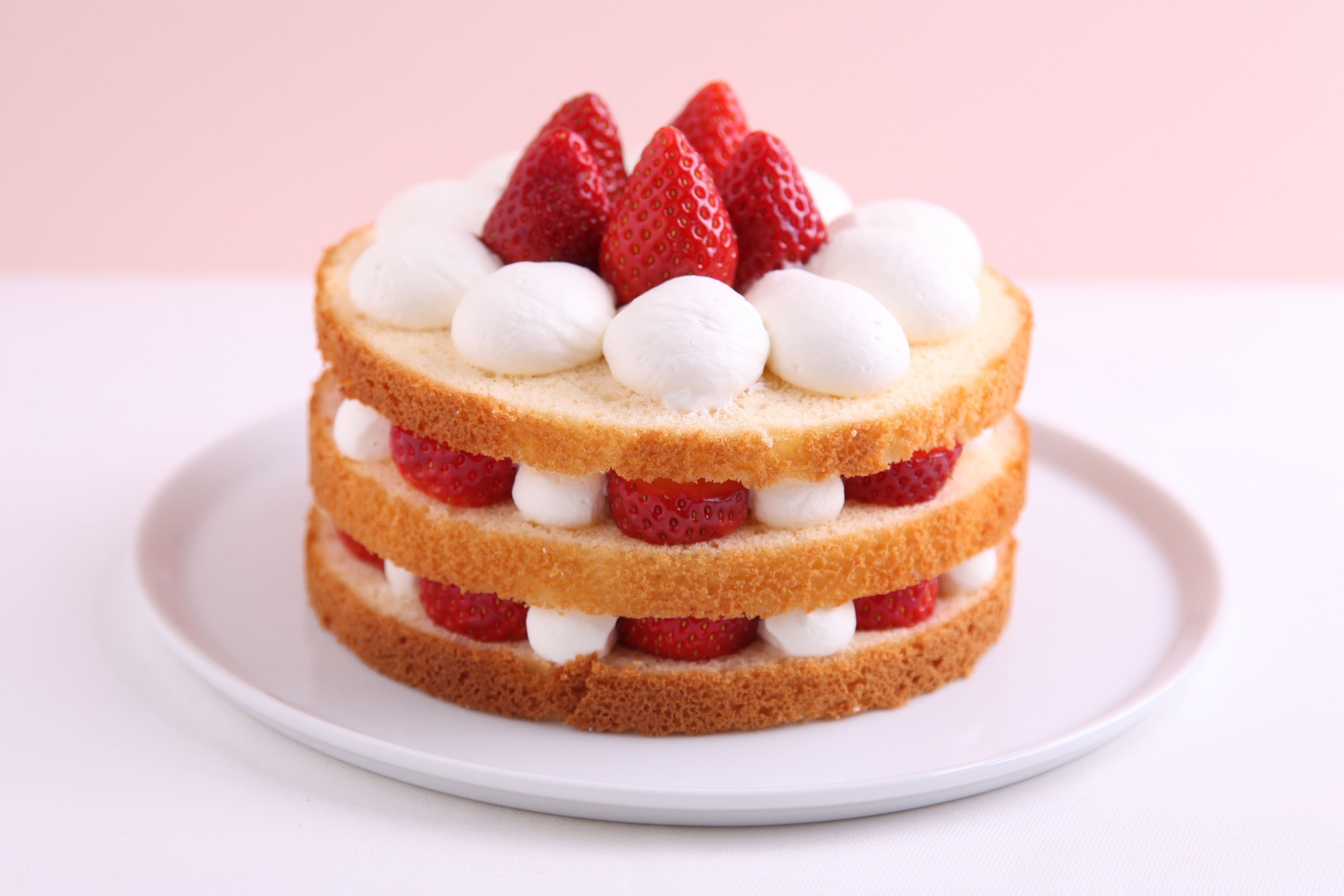 キメが細かく、しっとりとした「共立て法」のスポンジケーキに、苺と生クリームをたっぷり挟みました。
